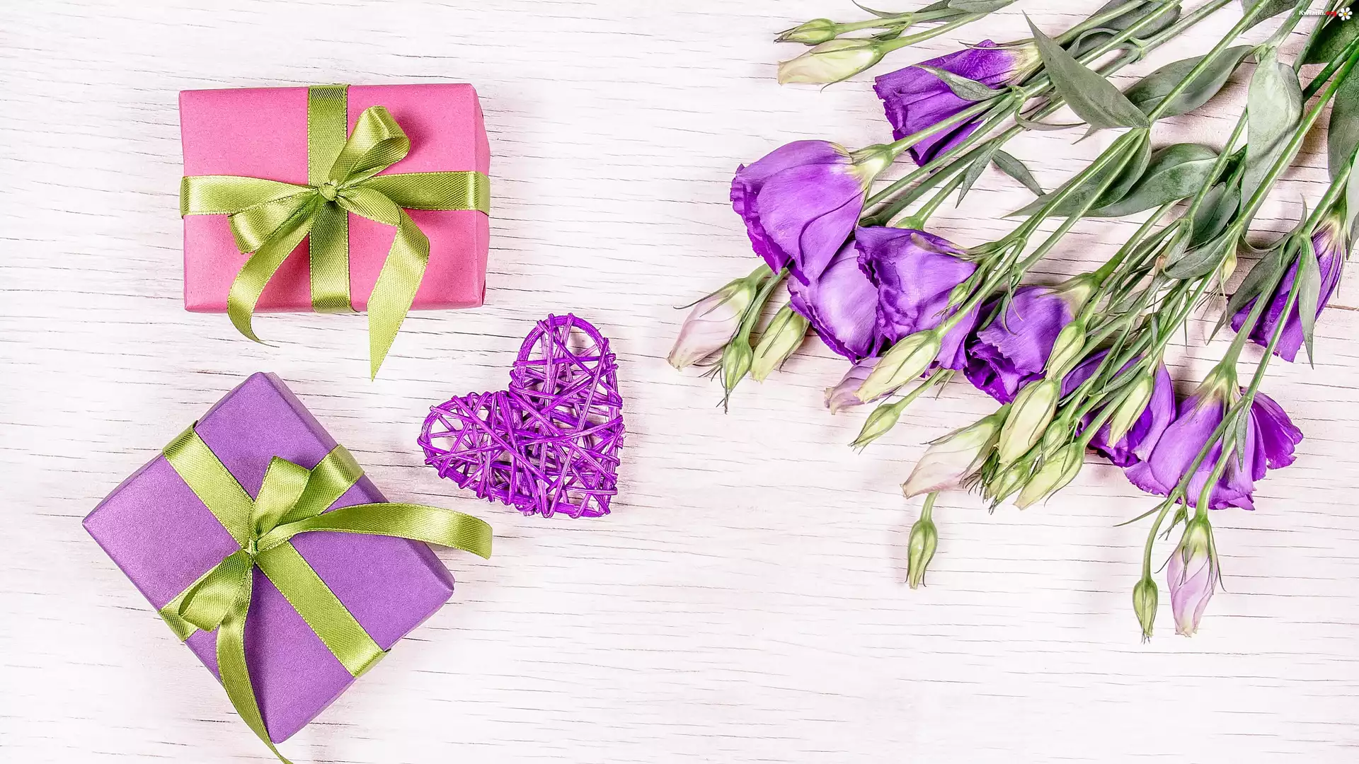 Prezenty, Serce, Fioletowe, Eustomy, Pąki, Walentynki - Zdjęcia