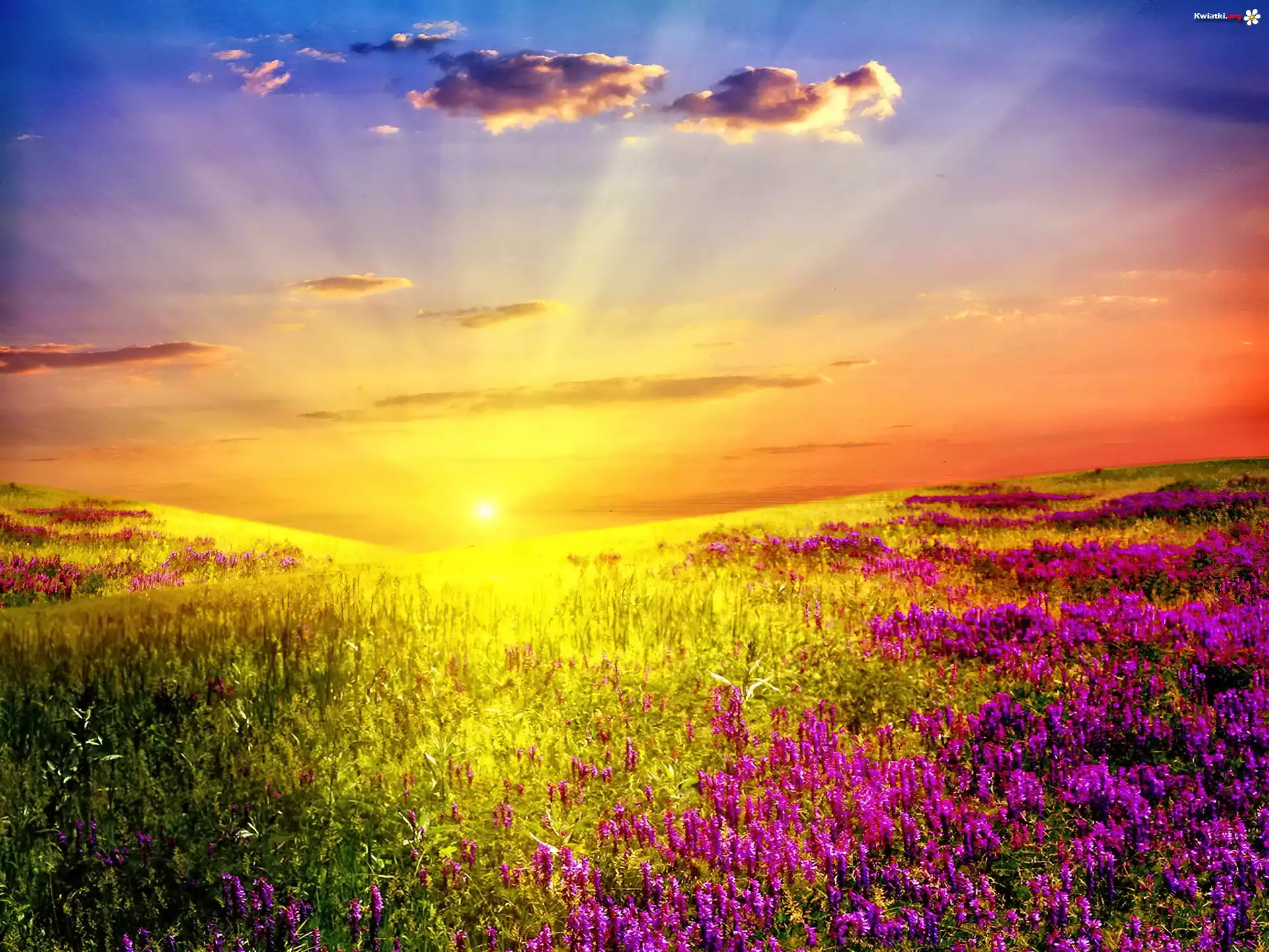 Promienie, Słońca, Łąka, Kwiaty - Zdjęcia