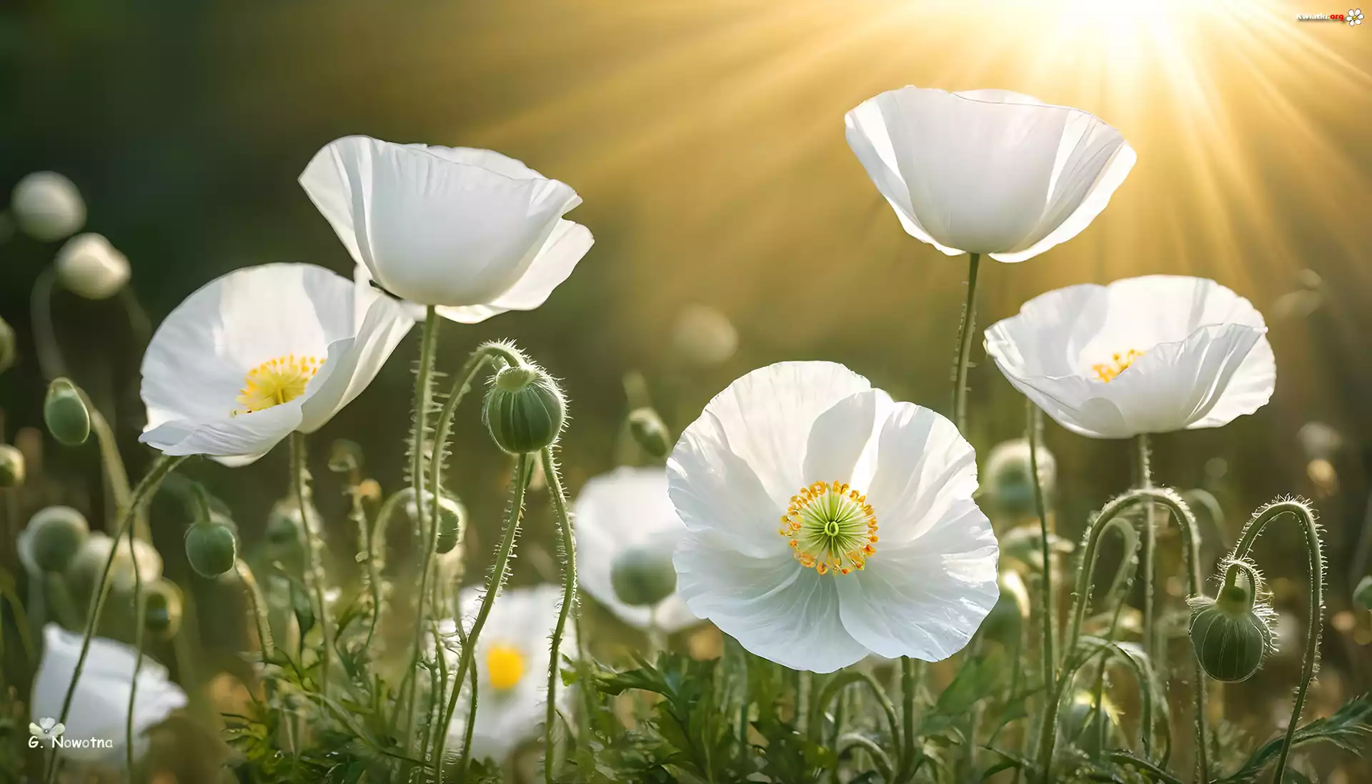 Kwiat Białe, Maki, Kwiaty, Promienie słońca, Grafika