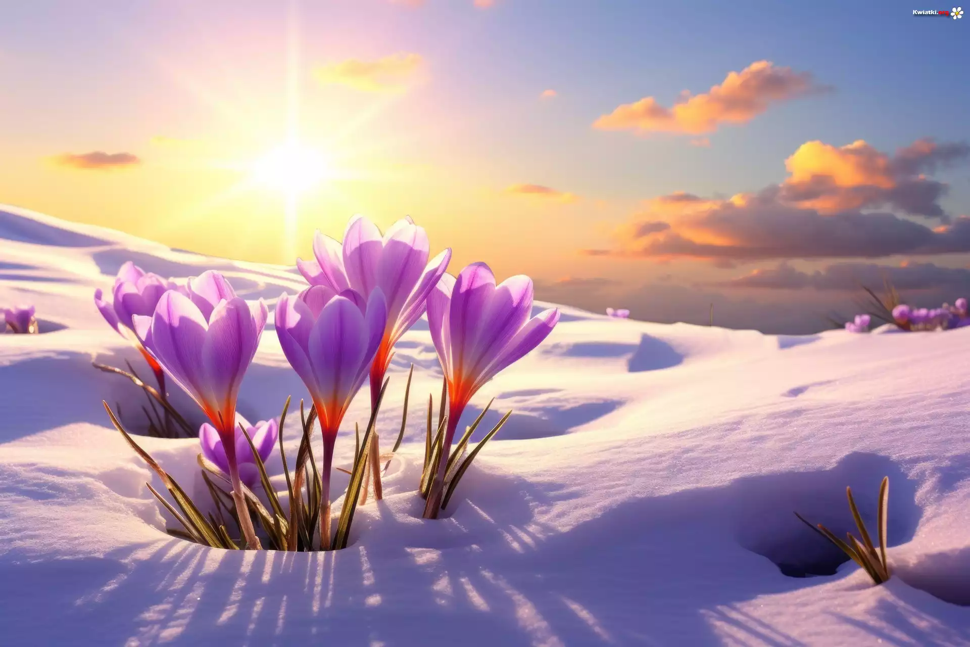 Kwiat Krokusy, Śnieg, Zima, Promienie słońca, Grafika
