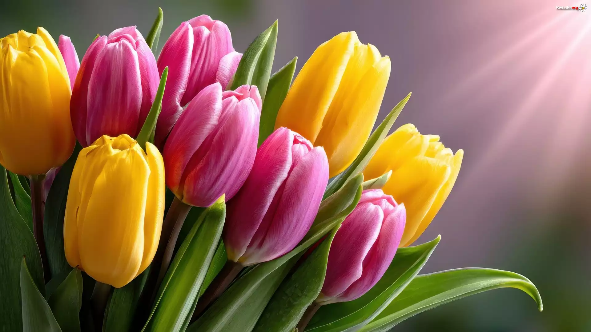 Kwiat Różowe, Żółte, Tulipany, Promienie