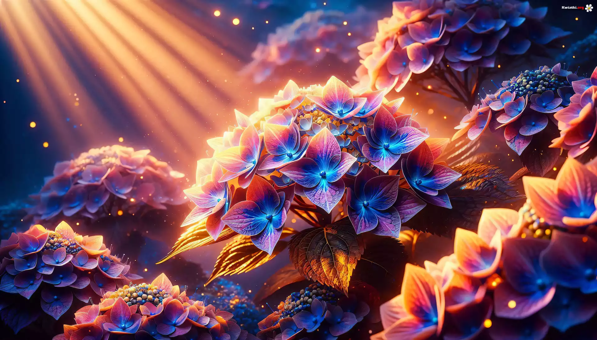 Kwiaty, Promienie słońca, Grafika, Hortensje - Zdjęcia