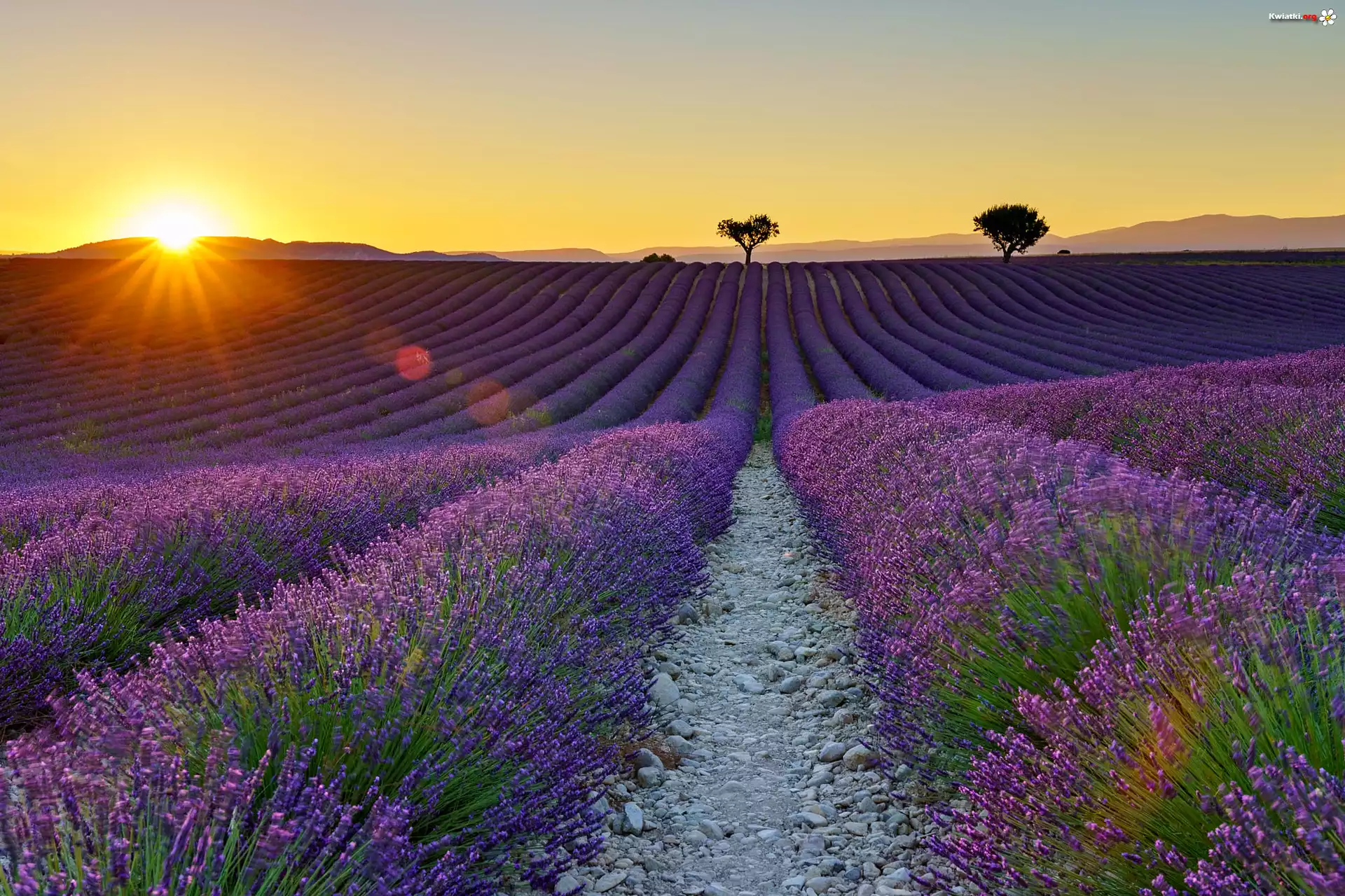 Kwiat Francja, Prowansja, Valensole, Pole, Lawenda, Zachód słońca, Drzewa