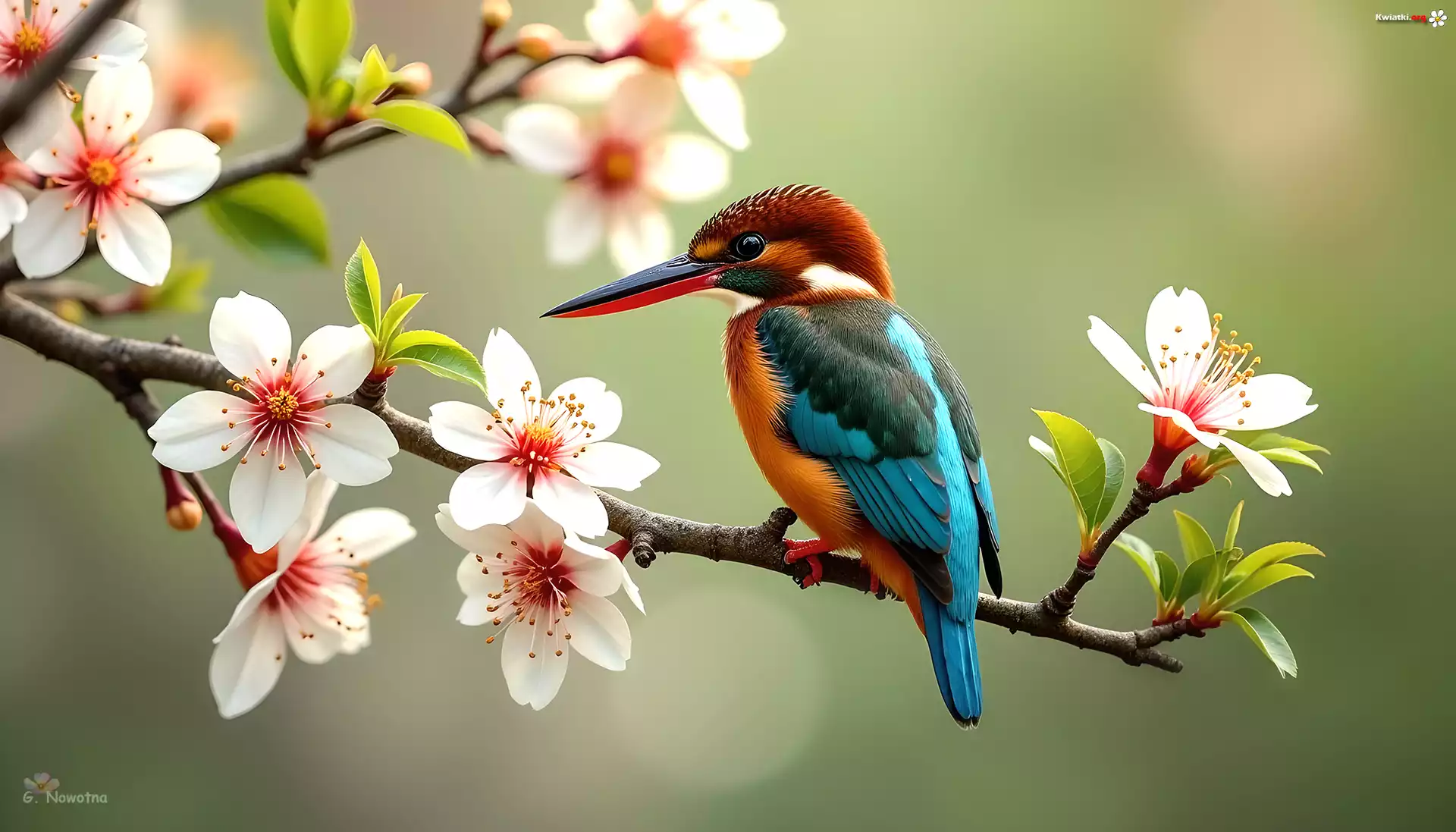 Zimorodek, Ptak, Gałązka, Kwiaty, Grafika - Zdjęcia