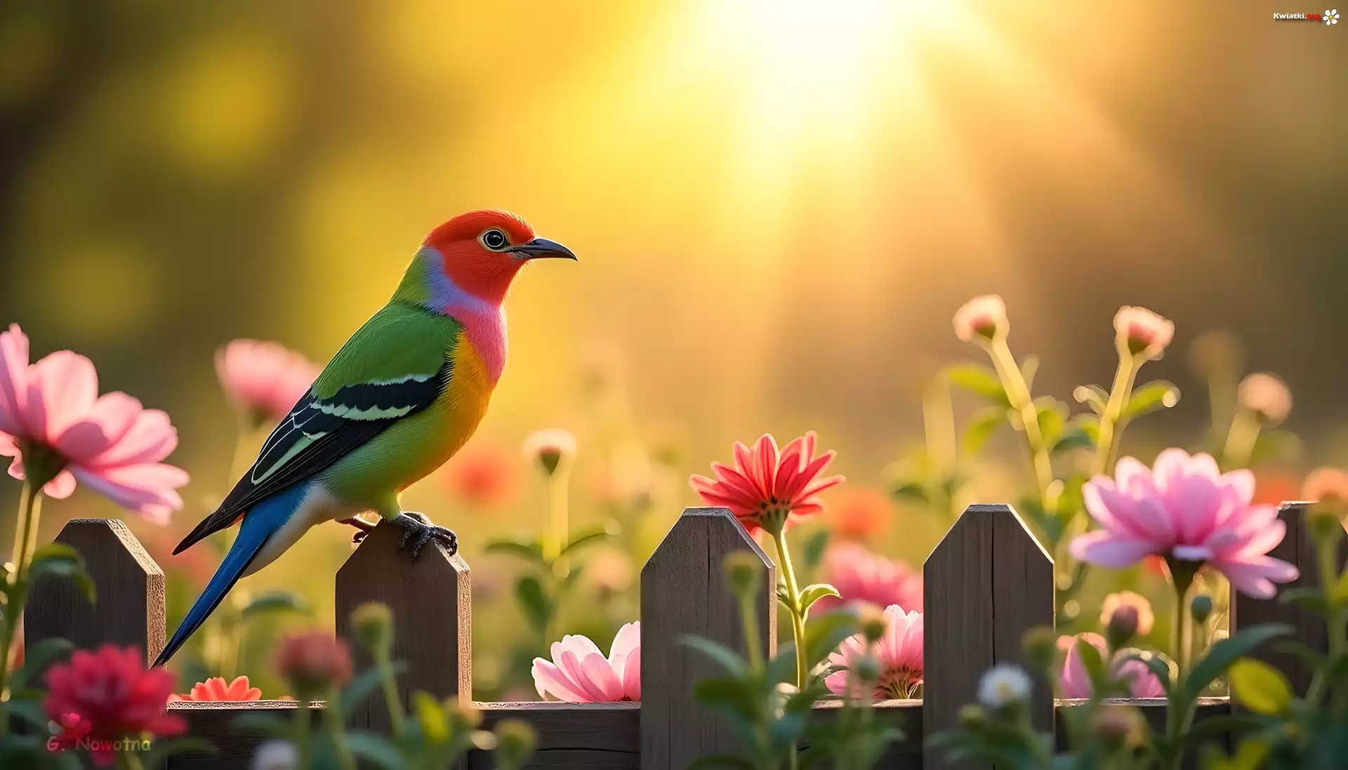 Kolorowy, Ptak, Płot, Kwiaty, Grafika - Zdjęcia