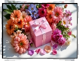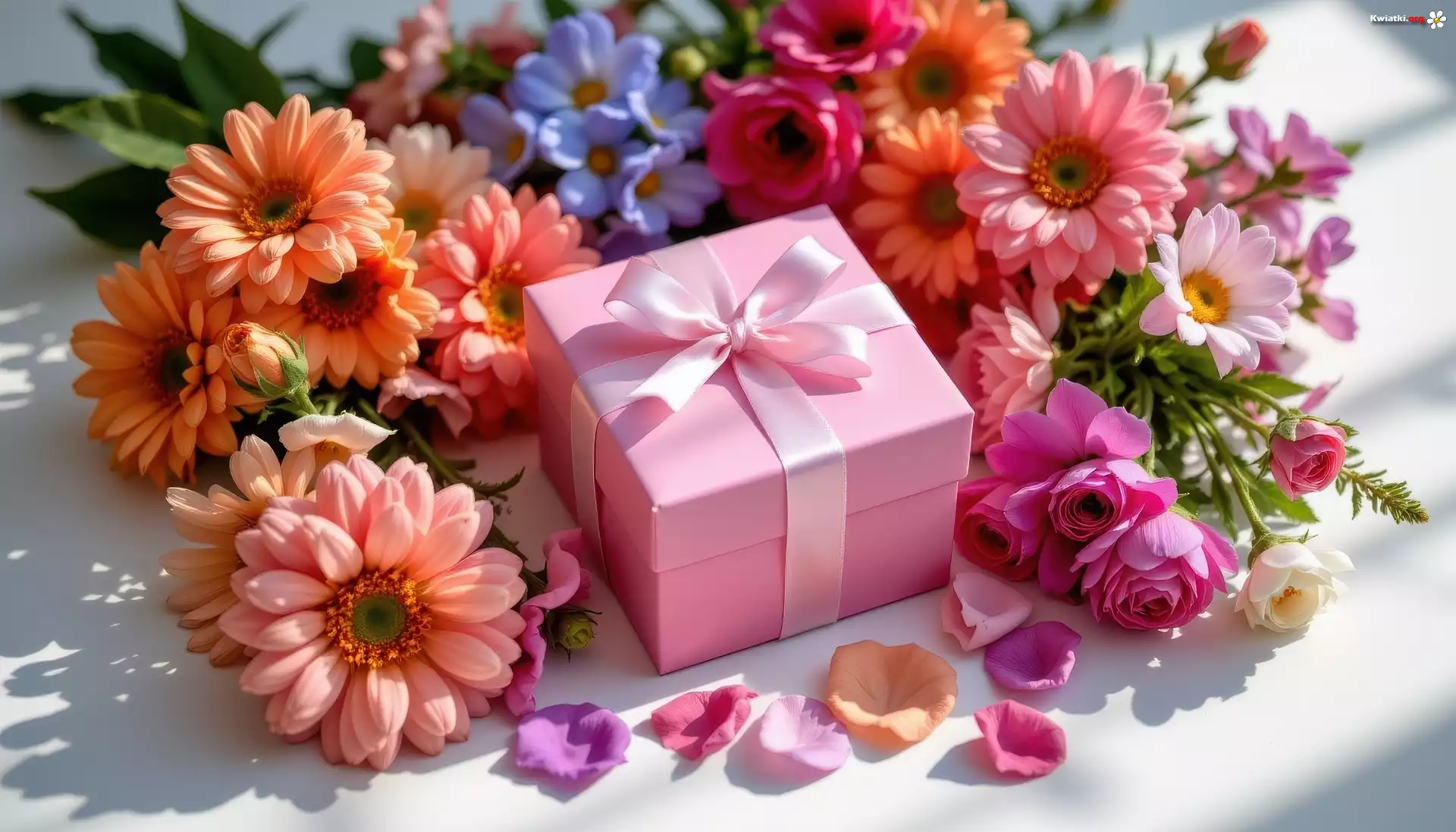 Kwiat Kolorowe, Kwiaty, Płatki, Pudełko, Prezent, Kokarda