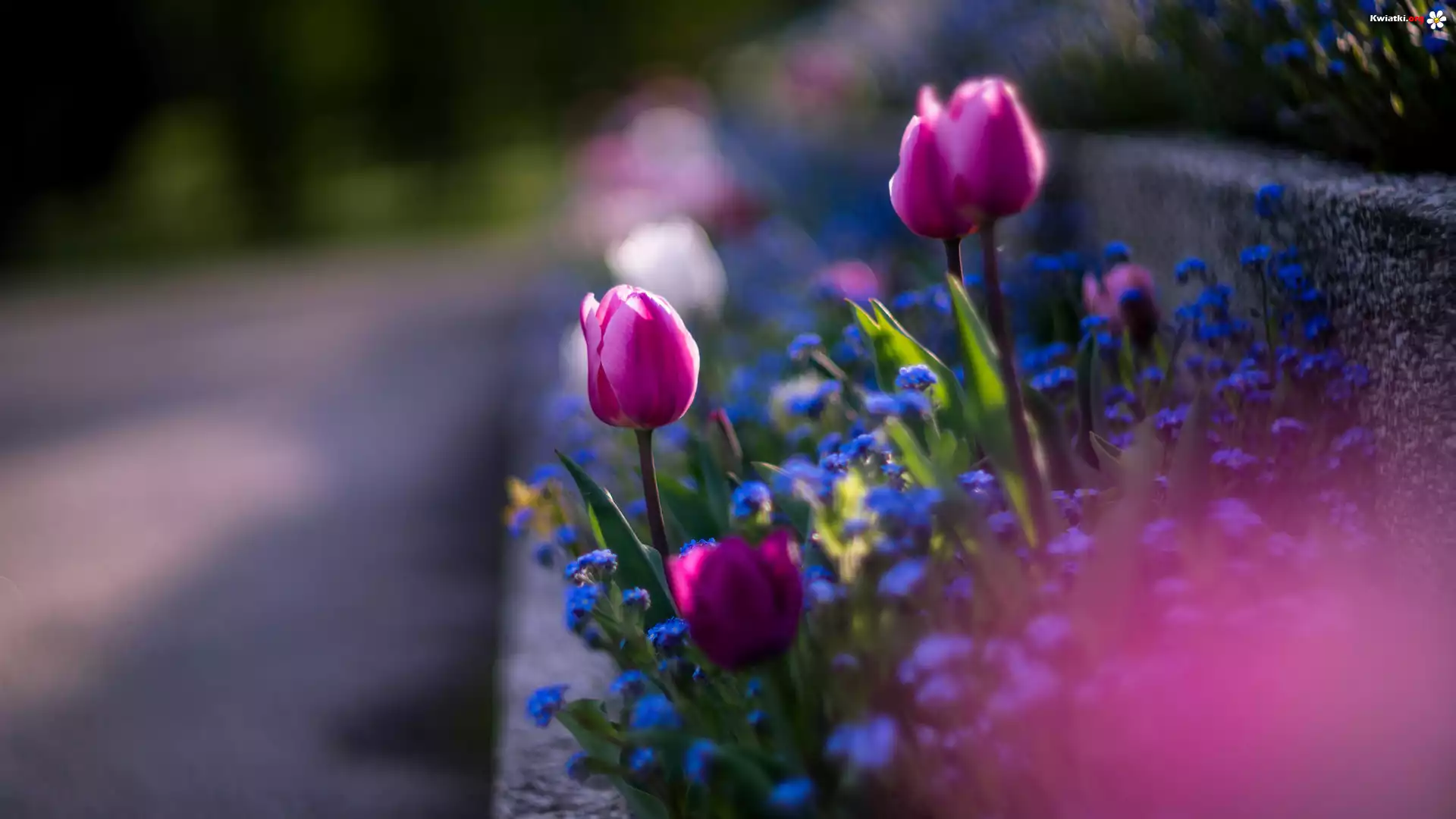 Rabatka, Tulipany, Niezapominajki, Rozmyte, Tło, Makro - Zdjęcia