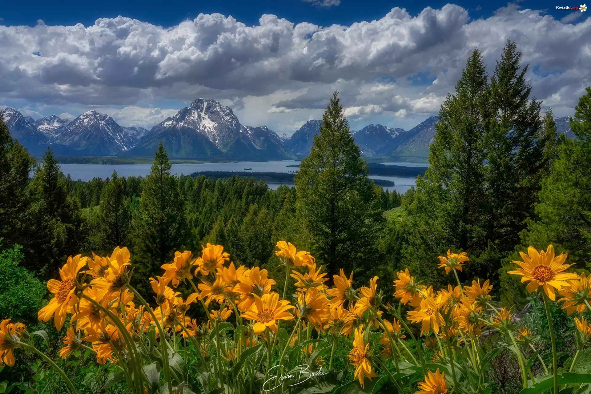 Stany Zjednoczone, Park Narodowy Grand Teton, Góry Teton Range, Drzewa, Las, Łąka, Kwiaty, Balsamorhiza - Zdjęcia |