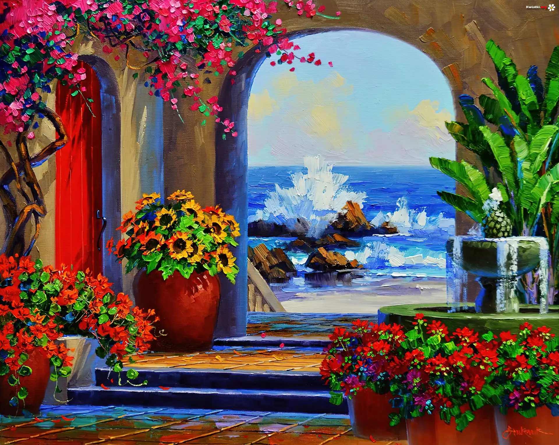 Kwiat Reprodukcje Obrazów, Kwiaty, Morze, Weranda