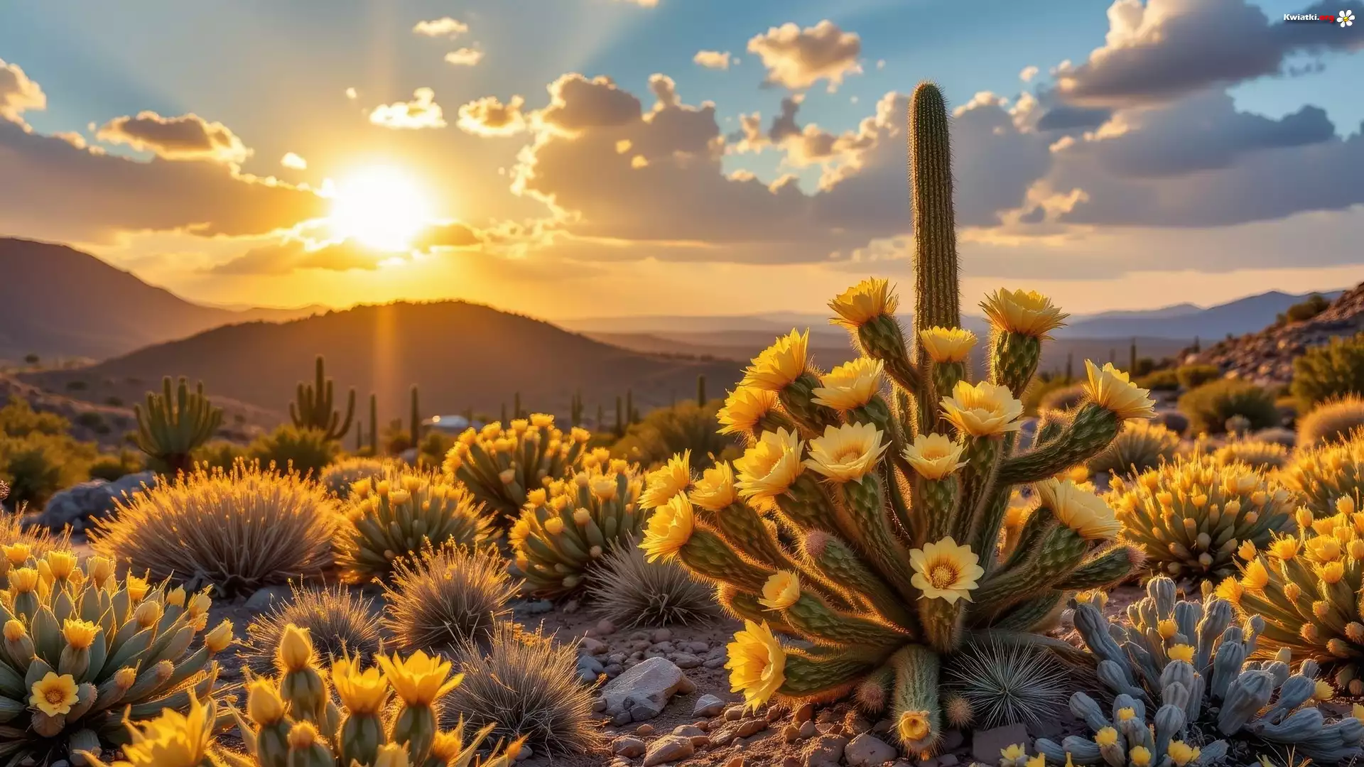 Kwitnące, Kaktusy, Żółte, Kwiaty, Słońce, Góry, Kępki, Roślin - Zdjęcia