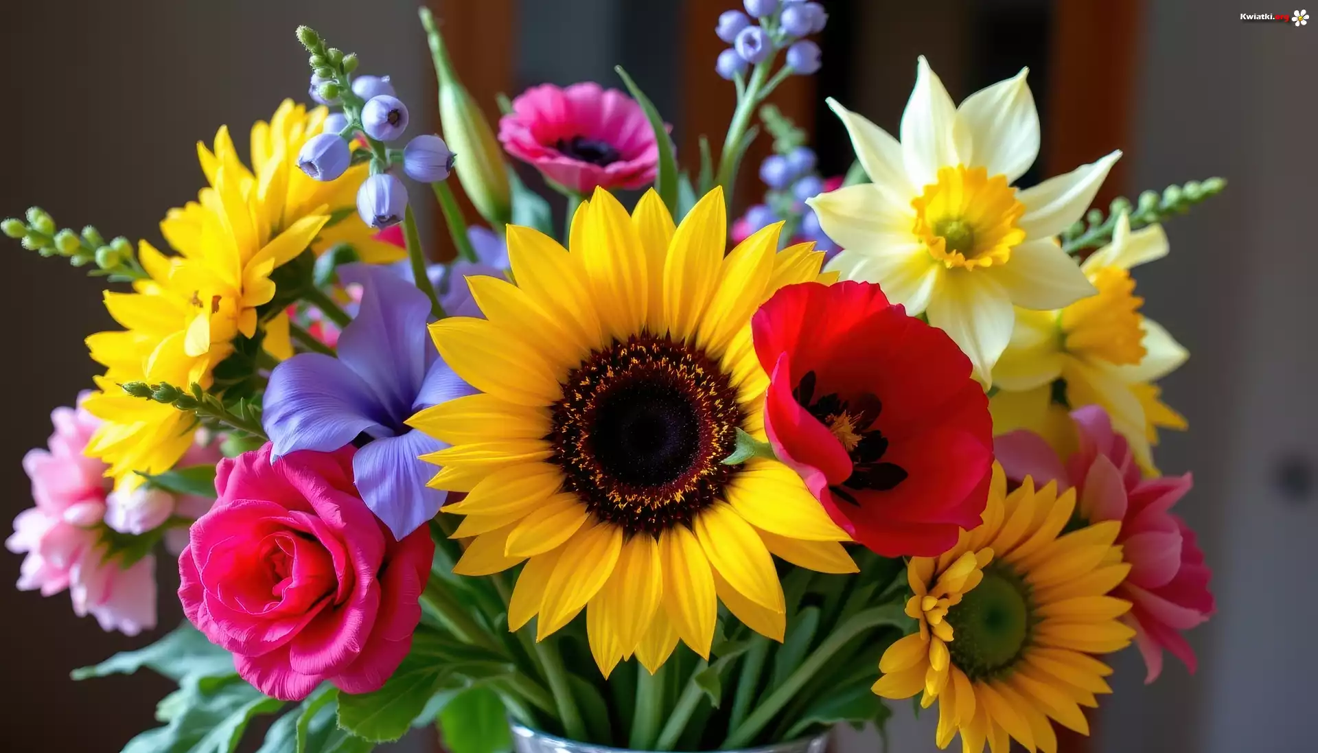 Kolorowe, Kwiaty, Słoneczniki, Róża, Narcyzy, Bukiet - Zdjęcia