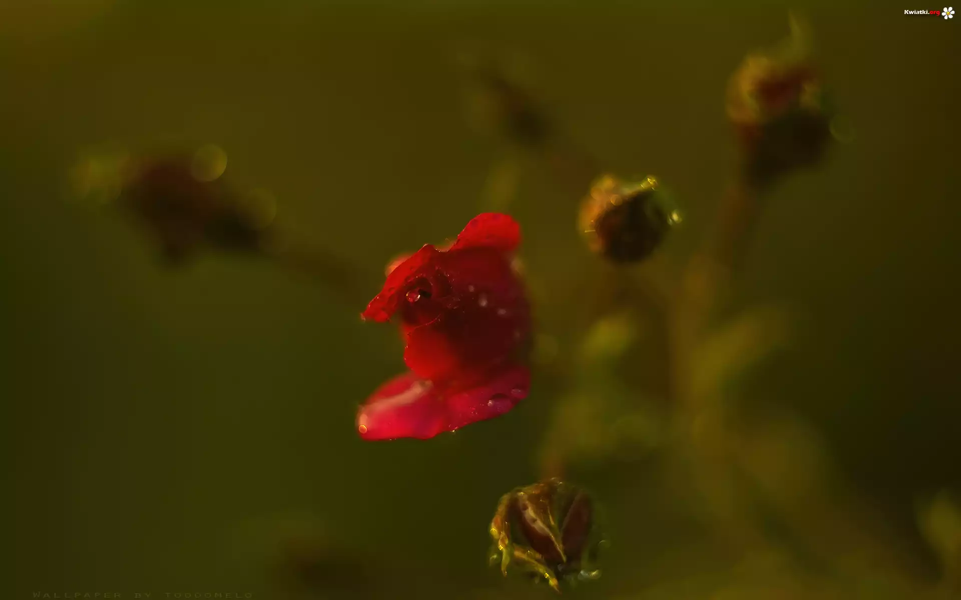 Kwiat Dzika róża, czerwona, pąki, krople wody.