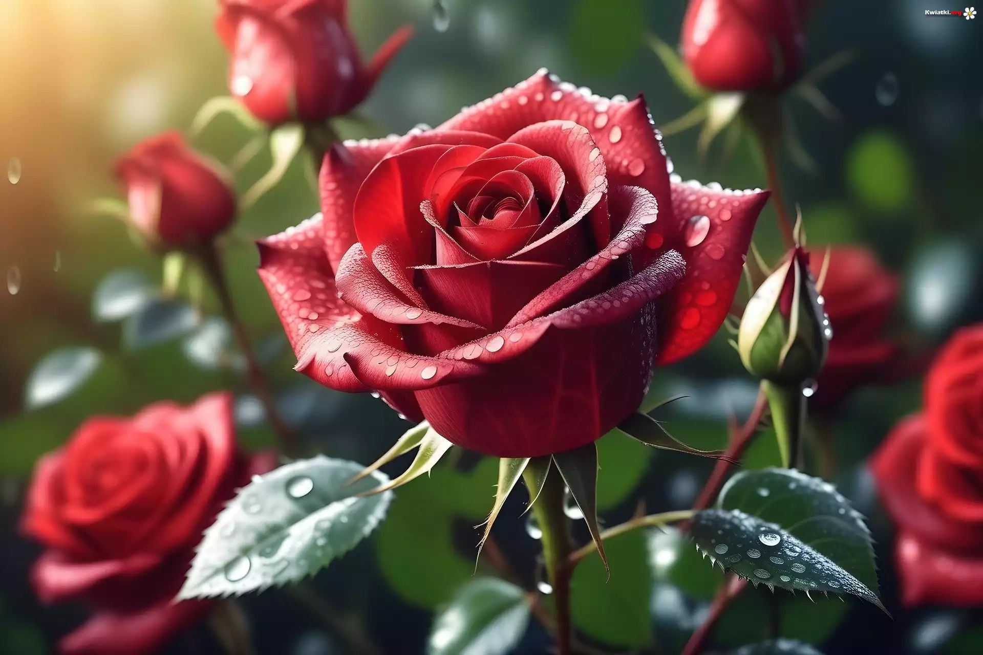 Kwiat Czerwona, Róża, Kwiat, Krople, Liście