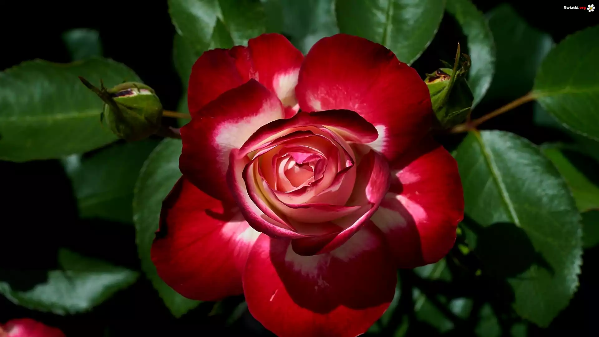 Róża, Czerwono-biała, Pąki, Rozwinięta, Liście - Zdjęcia