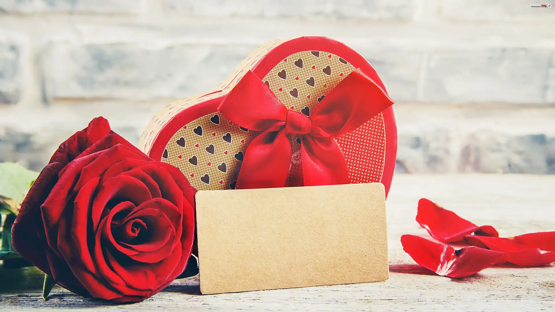 Kwiat Czerwona, Róża, Pudełko, Wstążka, Czekoladki, Serce, Karteczka, Walentynki