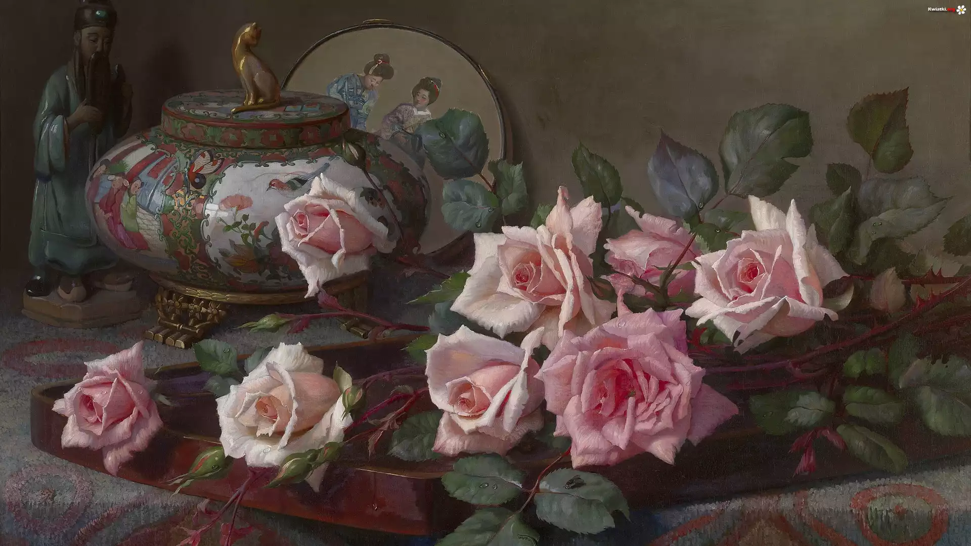 Kwiat Malarstwo, Obraz, Pascal De Beucker, Figurka, Kot, Szkatuła, Różowe, Róże