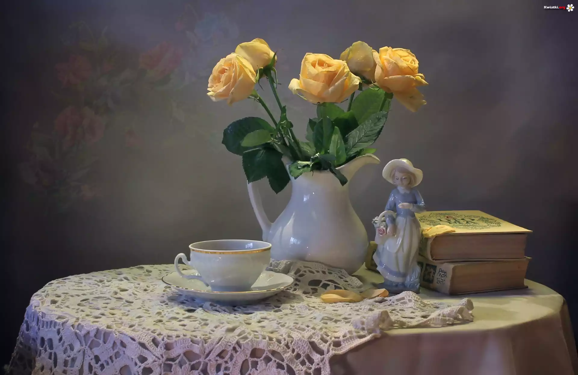 Kwiat Bukiet, Róże, Wazon, Figurka, Książki, Filiżanka, Kompozycja