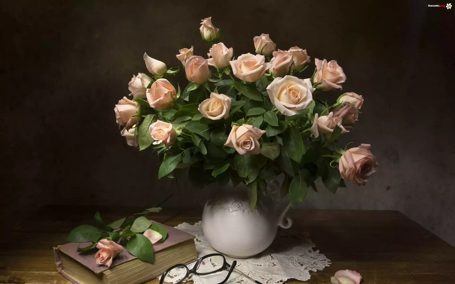 Kwiaty, Róże, Dzbanek, Książka, Okulary - Zdjęcia