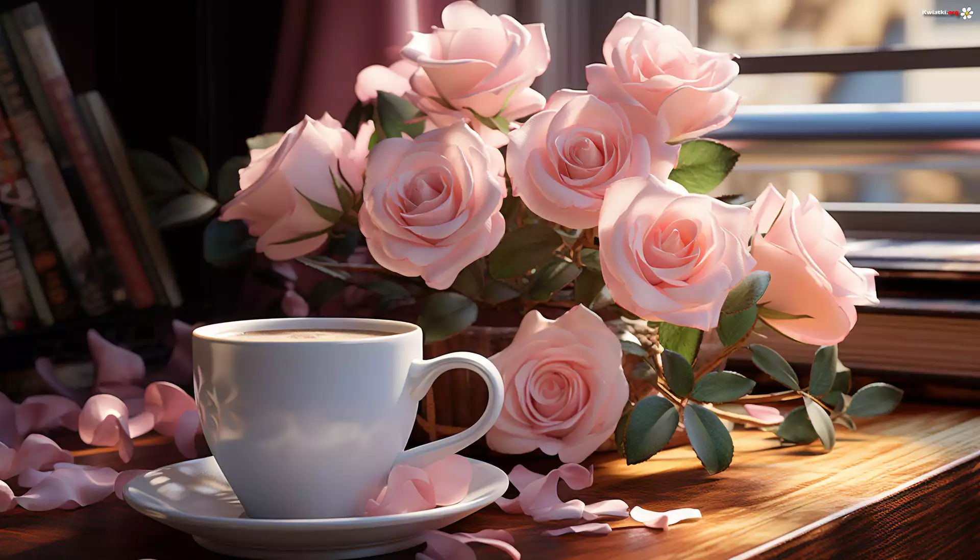 Bukiet, Róże, Filiżanka, Talerzyk, Kawa - Zdjęcia