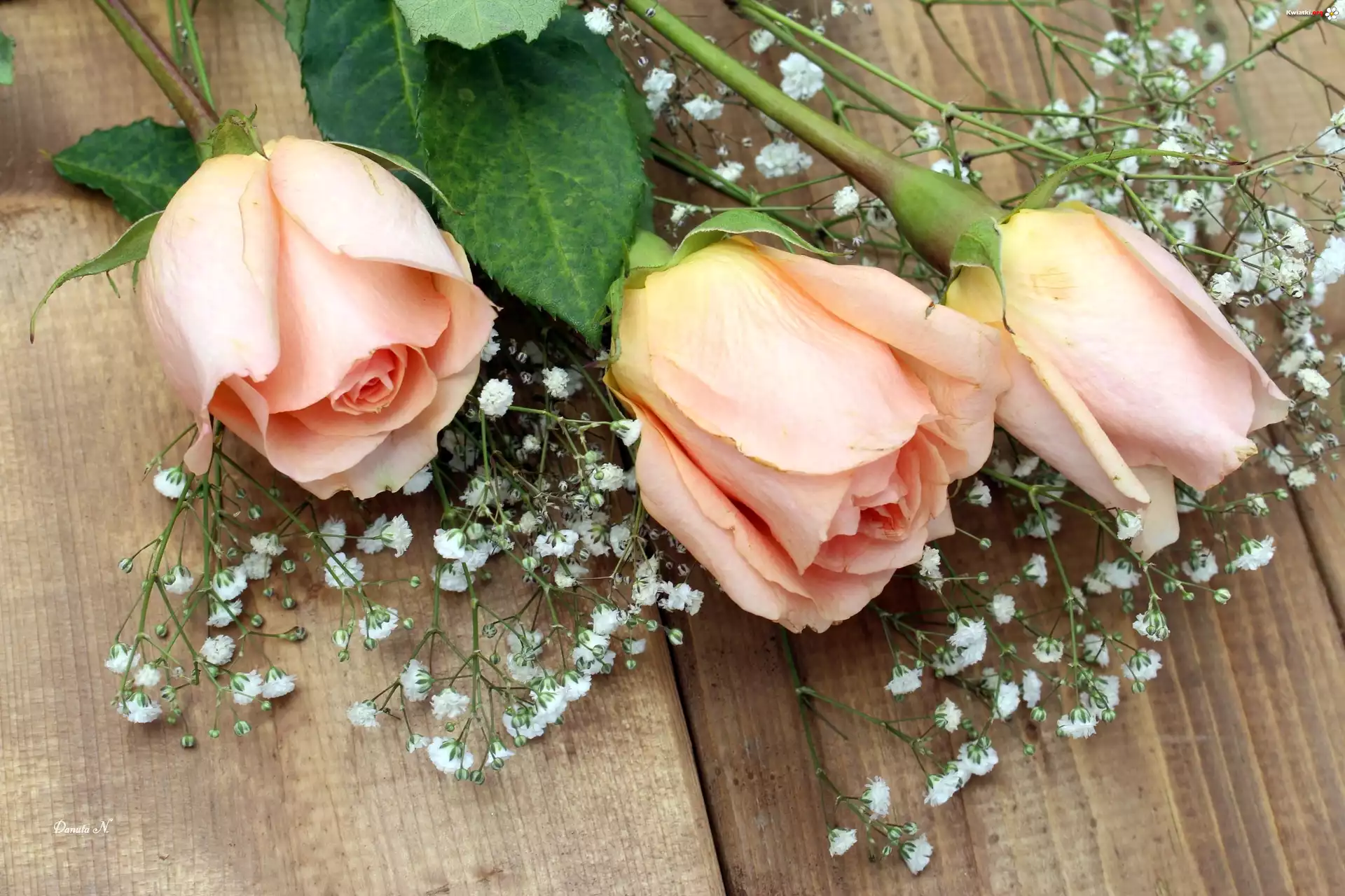 Róże, Herbaciane, Liście, Gipsówka, Deski - Zdjęcia