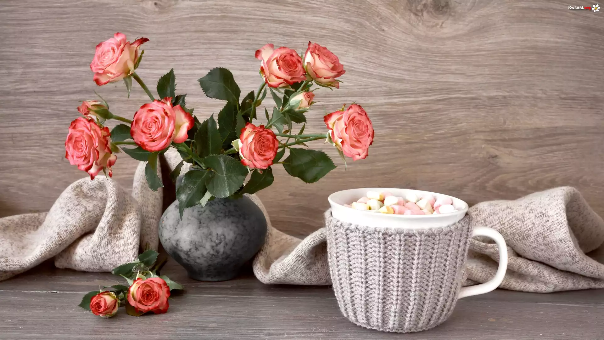 Kwiaty, Róże, Wazon, Kubek, Pianki, Deski, Materiał, Kompozycja - Zdjęcia