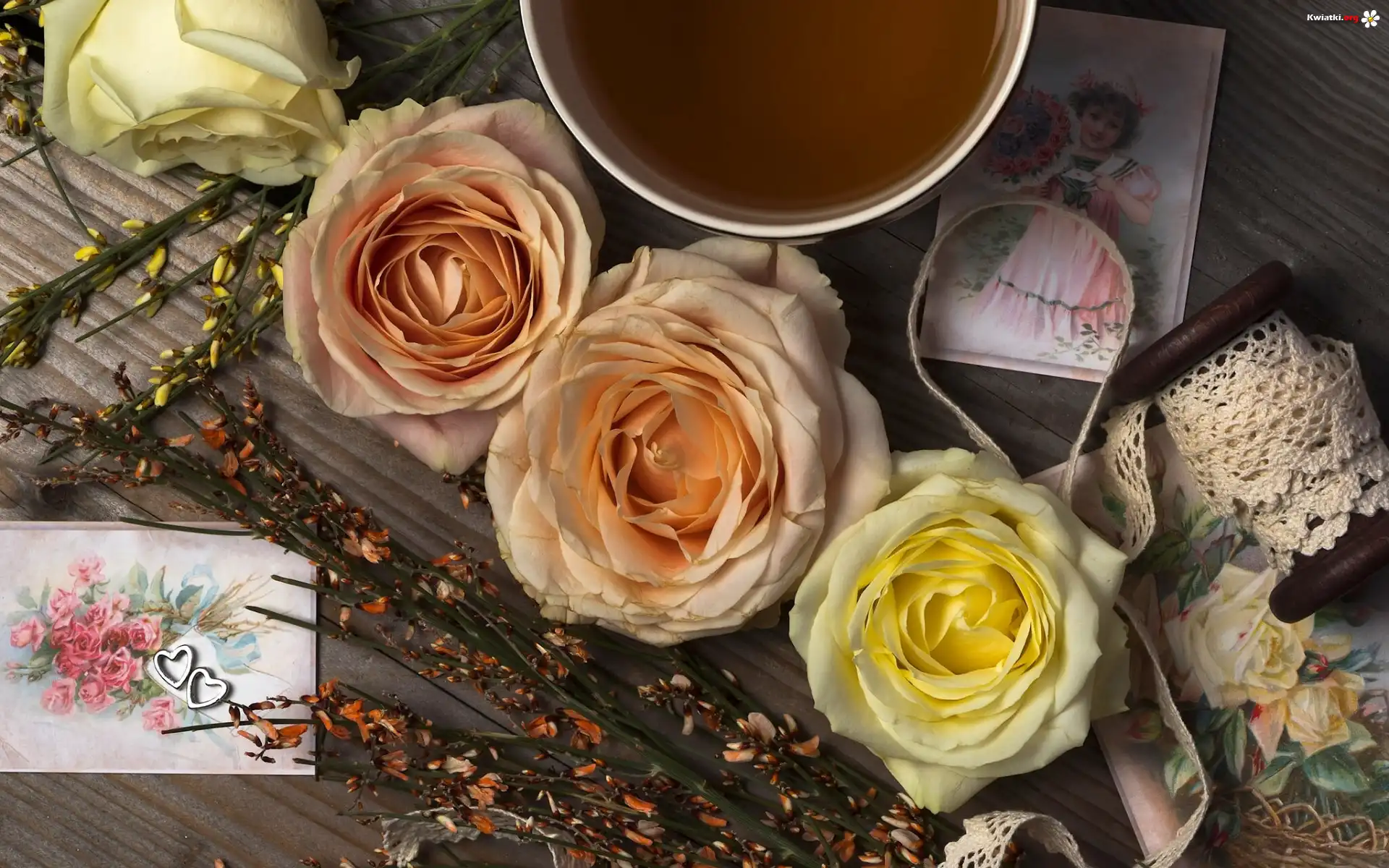 Kwiat Kwiaty, Róże, Szpulka, Koronka, Herbata, Filiżanka, Kartki, Kompozycja