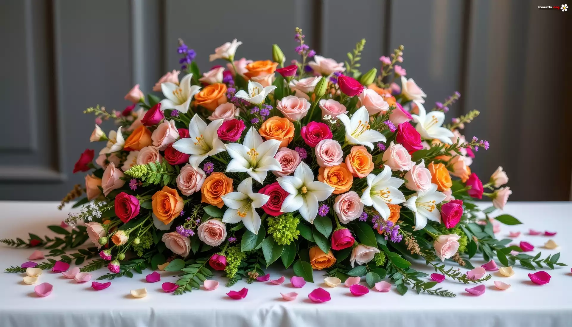 Bukiet, Kolorowe, Kwiaty, Róże, Lilie, Płatki, Stół - Zdjęcia