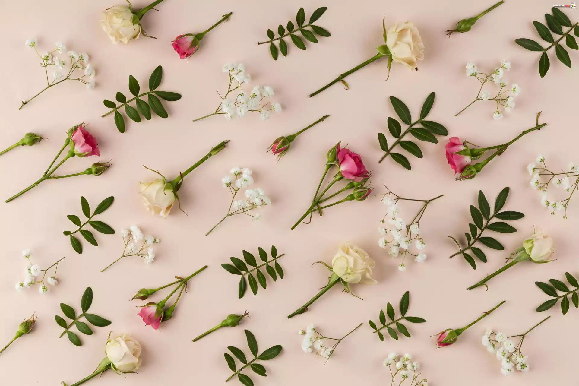 Kwiat Kwiaty, Róże, Białe, Czerwone, Biała, Gipsówka, Liście