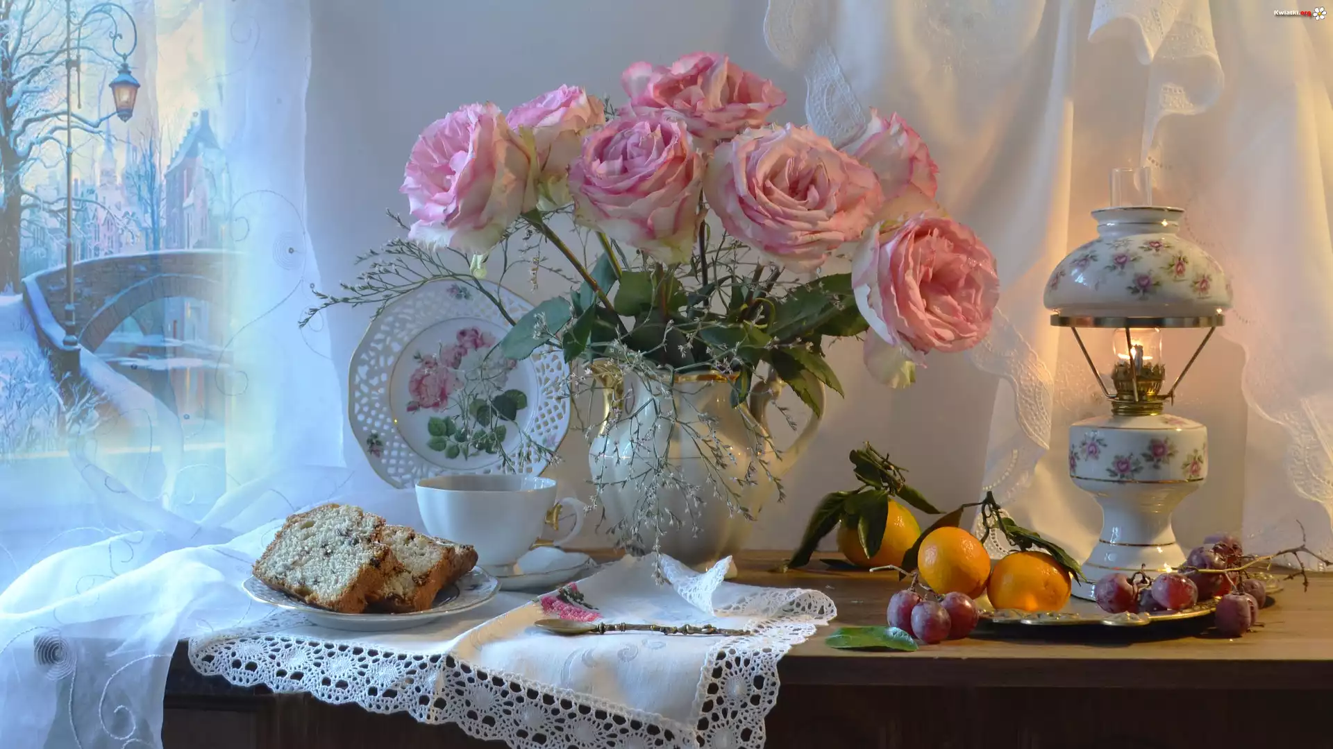 Różowe, Róże, Bukiet, Dzbanek, Lampa, Talerze, Ciasto, Owoce - Zdjęcia