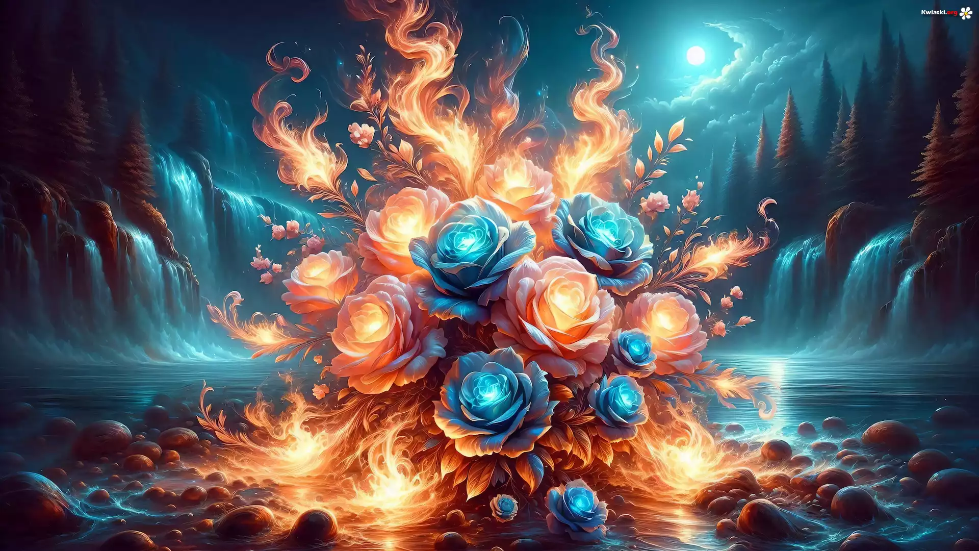 Kwiat Grafika, Róże, Płomienie, Księżyc, Wodospady