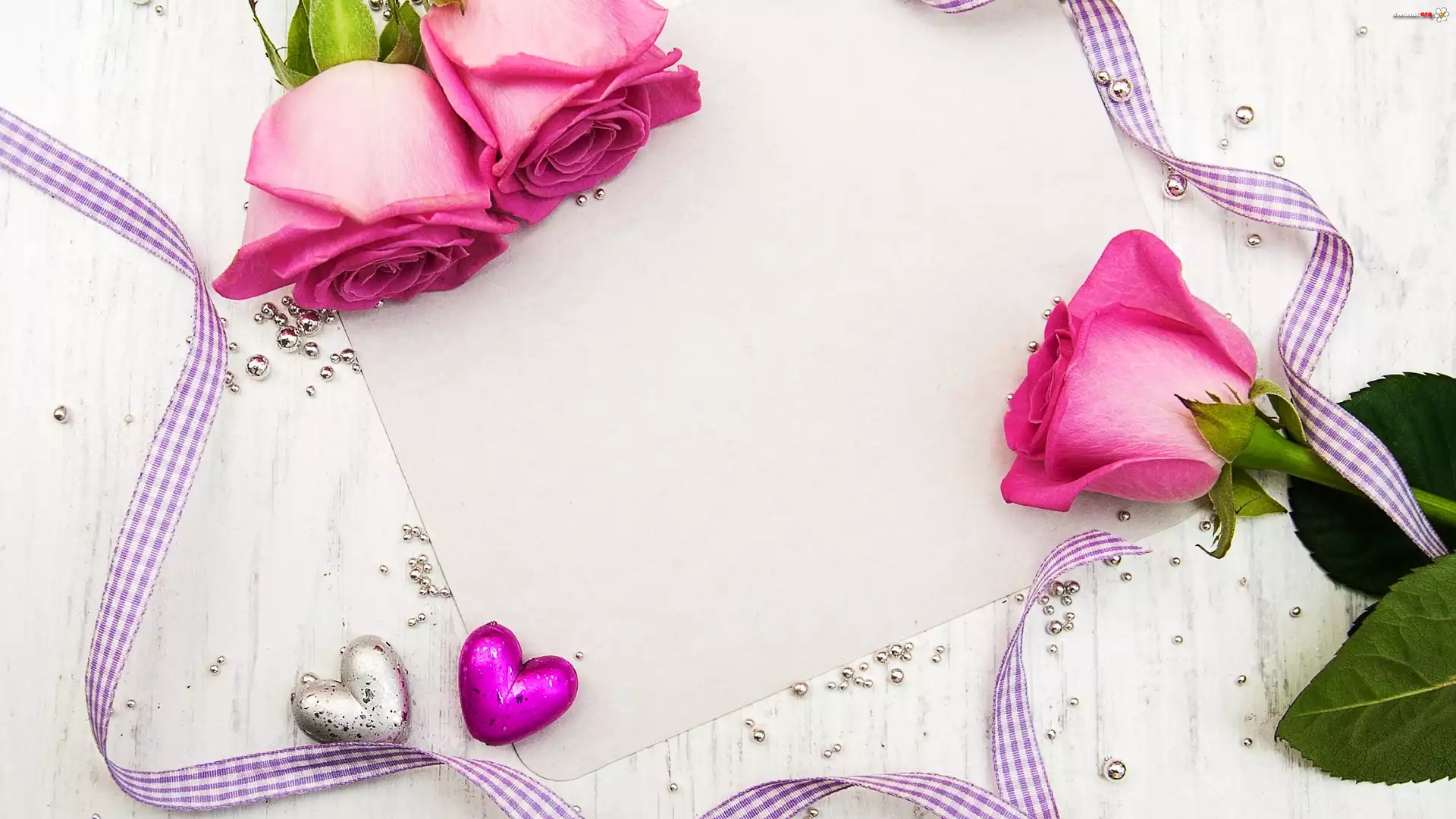 Kwiat Różowe, Róże, Kartka, Wstążka, Serduszka, Koraliki, Deski