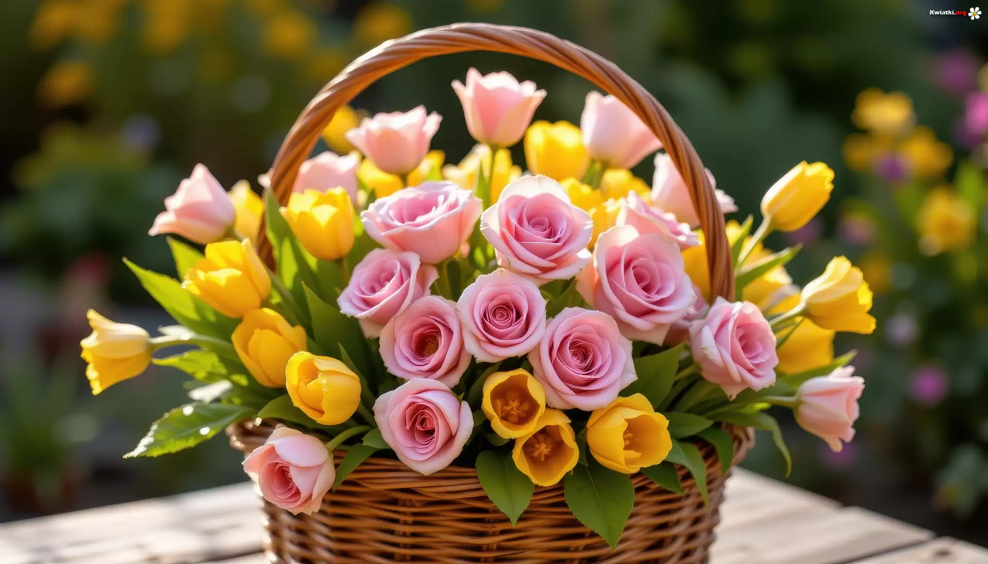 Żółte, Tulipany, Różowe, Róże, Wiklinowy, Koszyk, Kwiaty - Zdjęcia