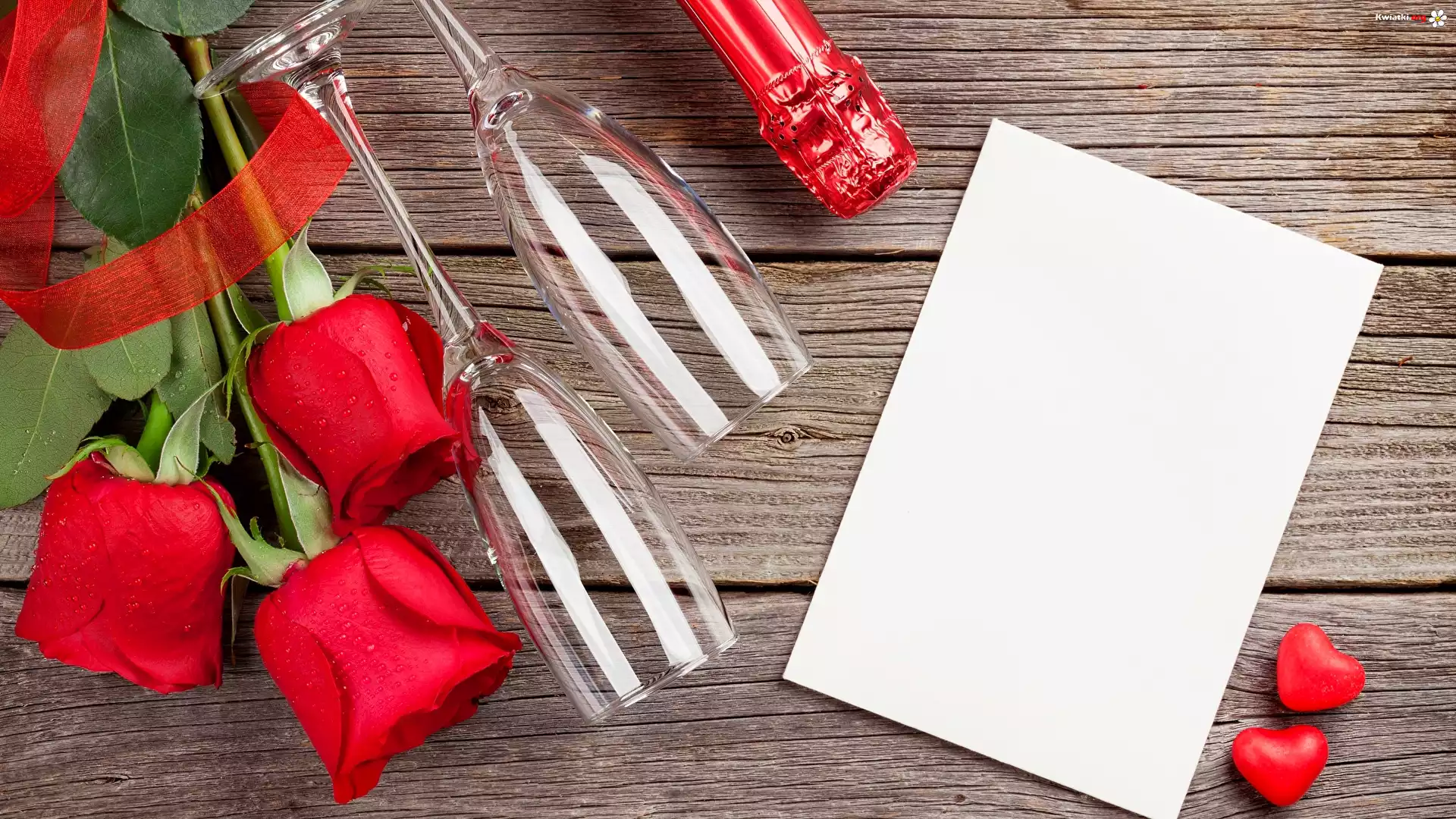 Kwiat Róże, Kieliszki, Szampan, Kartka, Serduszka, Walentynki