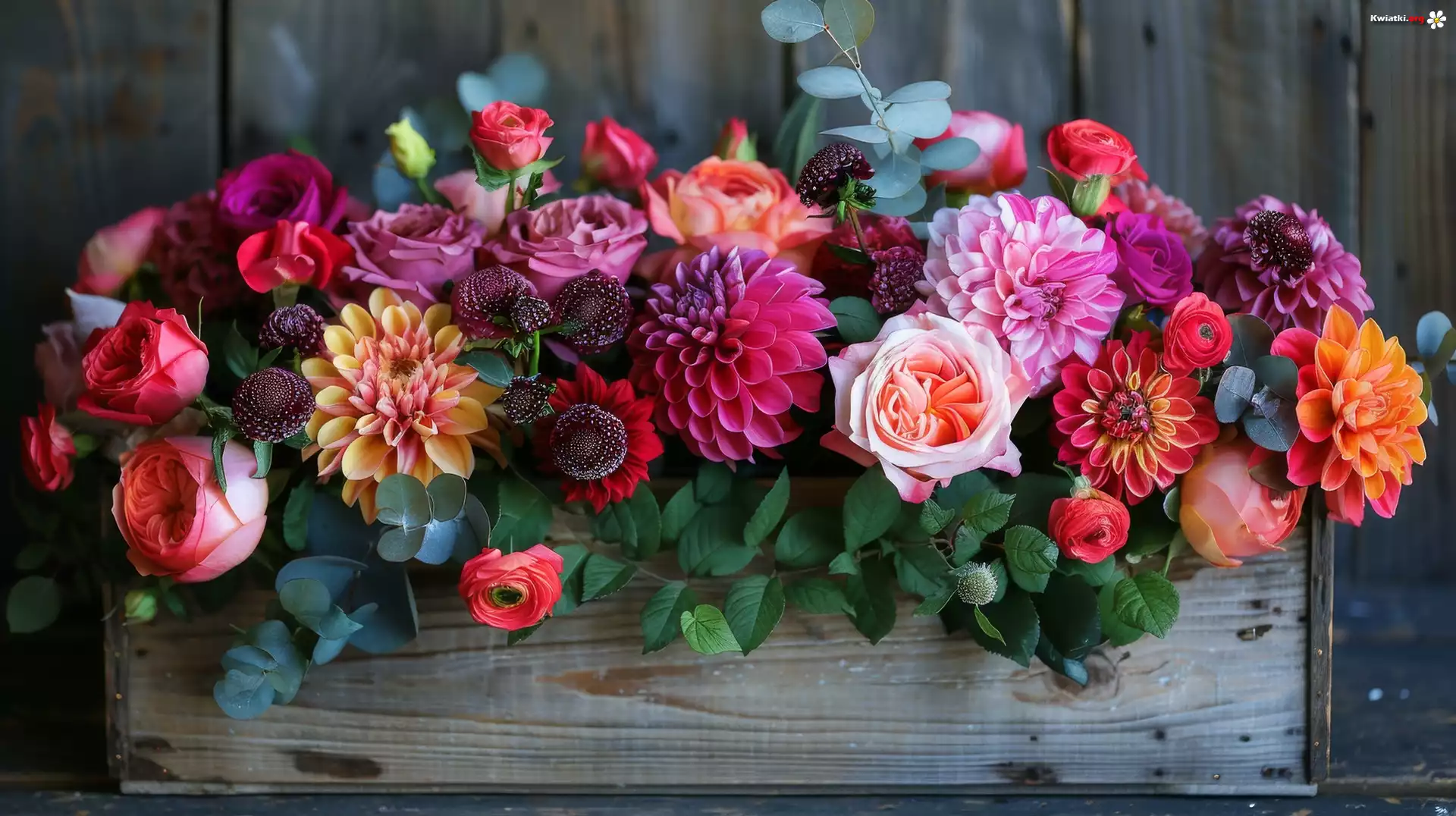 Kolorowe, Kwiaty, Dalie, Róże, Liście, Skrzynka - Zdjęcia