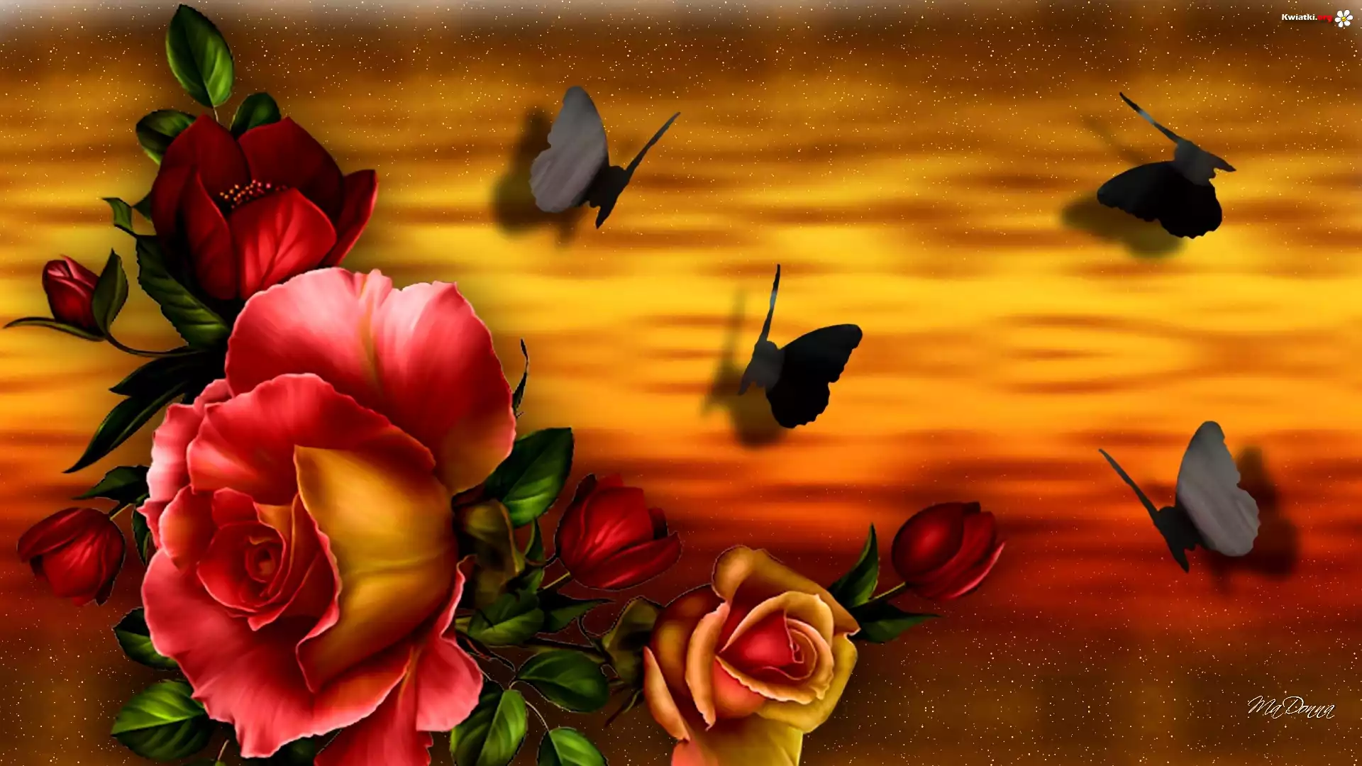 Kwiat Róże, Motyle, Zachód Słońca, Art