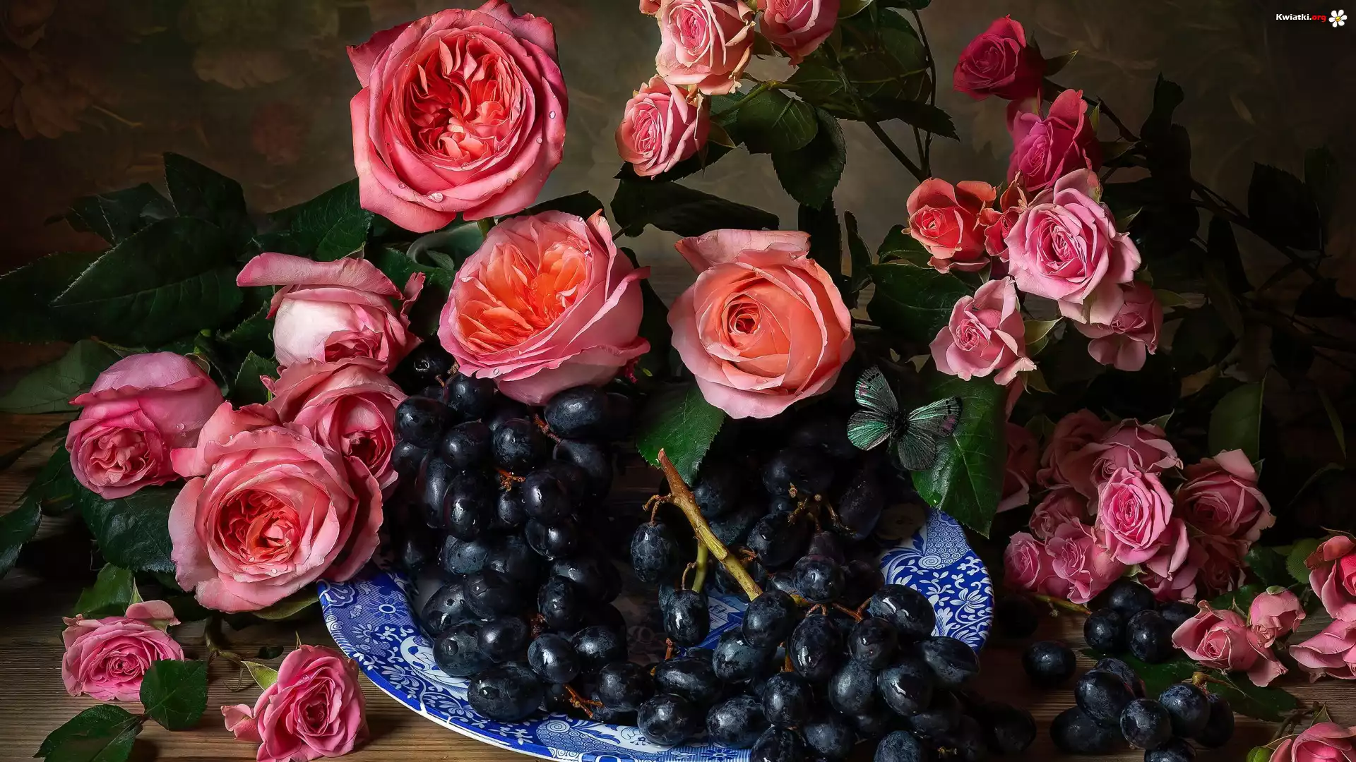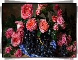 Różowe, Róże, Talerz, Czarne, Winogrona - Zdjęcia