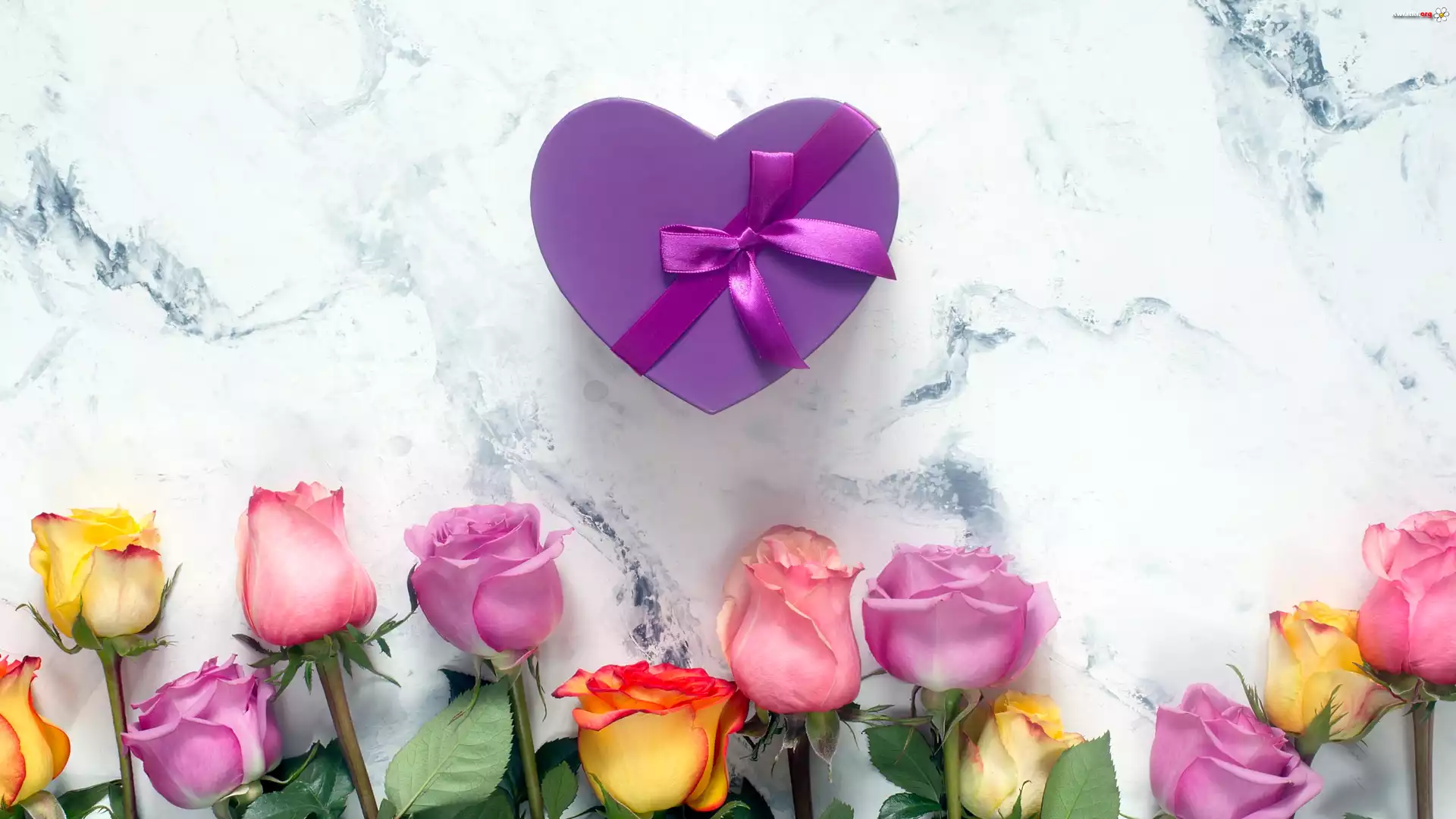 Kwiat Kolorowe, Róże, Fioletowe, Pudełko, Serce, Wstążka, Marmurkowe tło