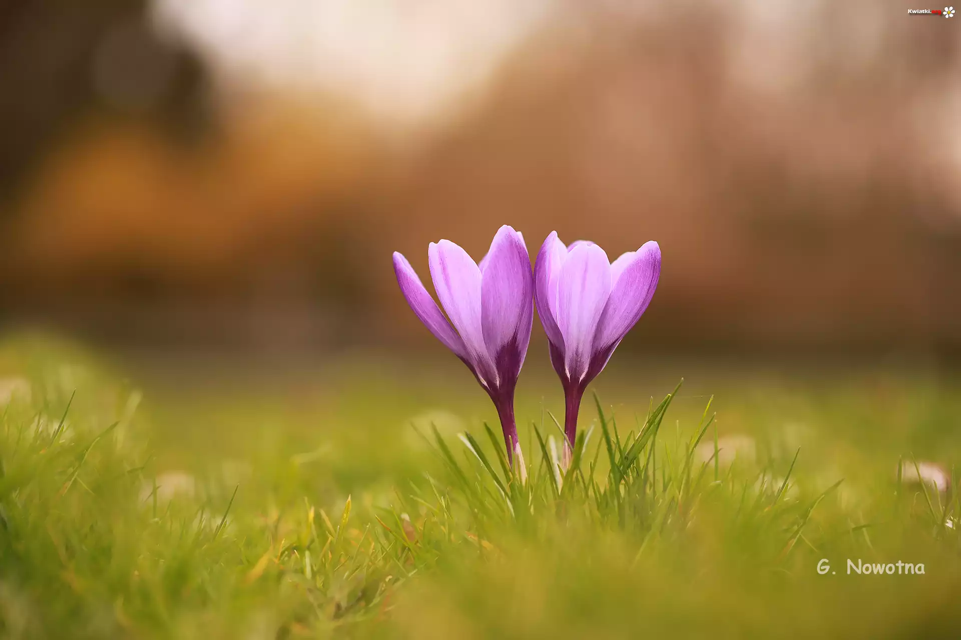 Kwiat Dwa, Rozkwitające, Fioletowe, Krokusy, Kwiaty
