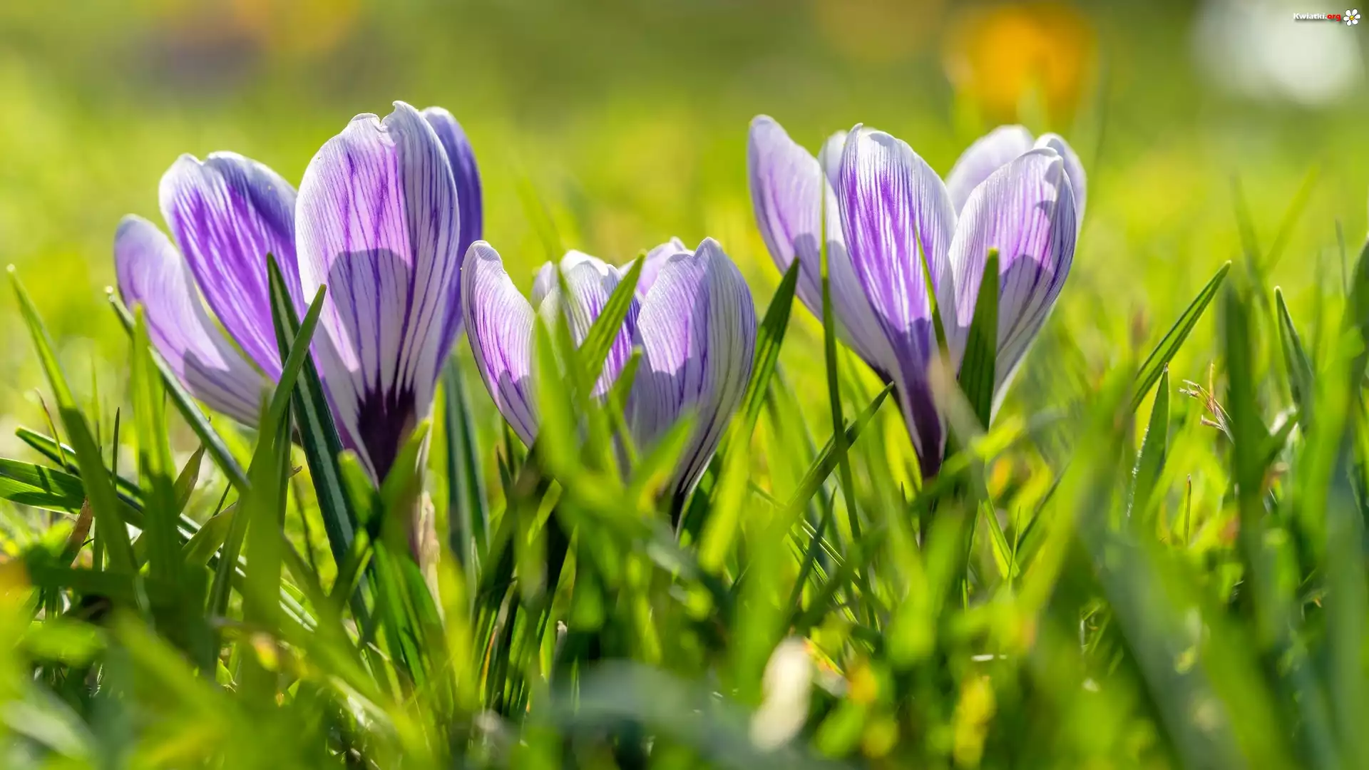 Kwiat Krokusy, Fioletowe, Trawa, Rozmycie