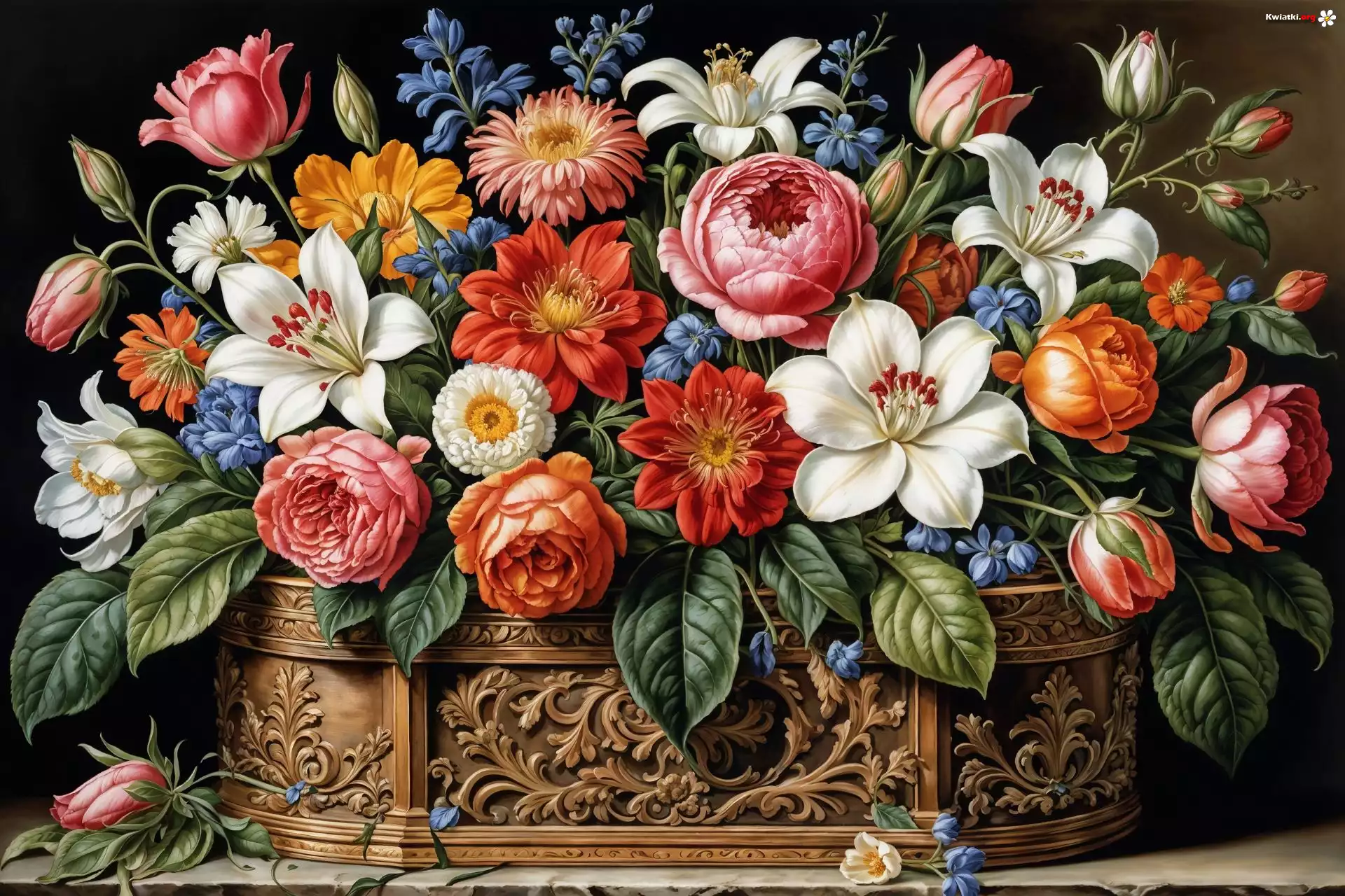 Kwiaty, Różnokolorowe, Bukiet, Ozdobna, Skrzynka - Zdjęcia
