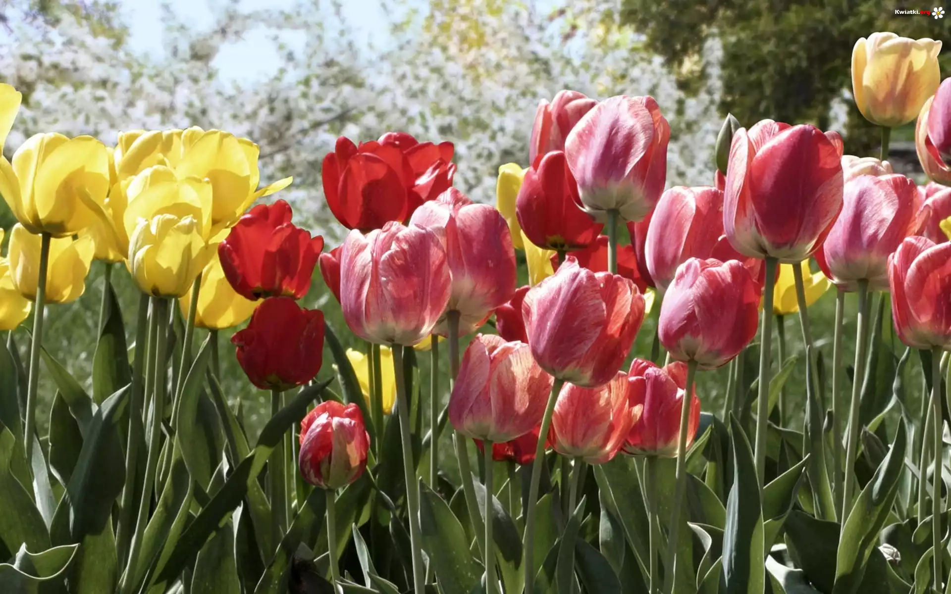 Kwiat Różnokolorowe, Tulipany, Żółte, Czerwone, Czerwono, Białe