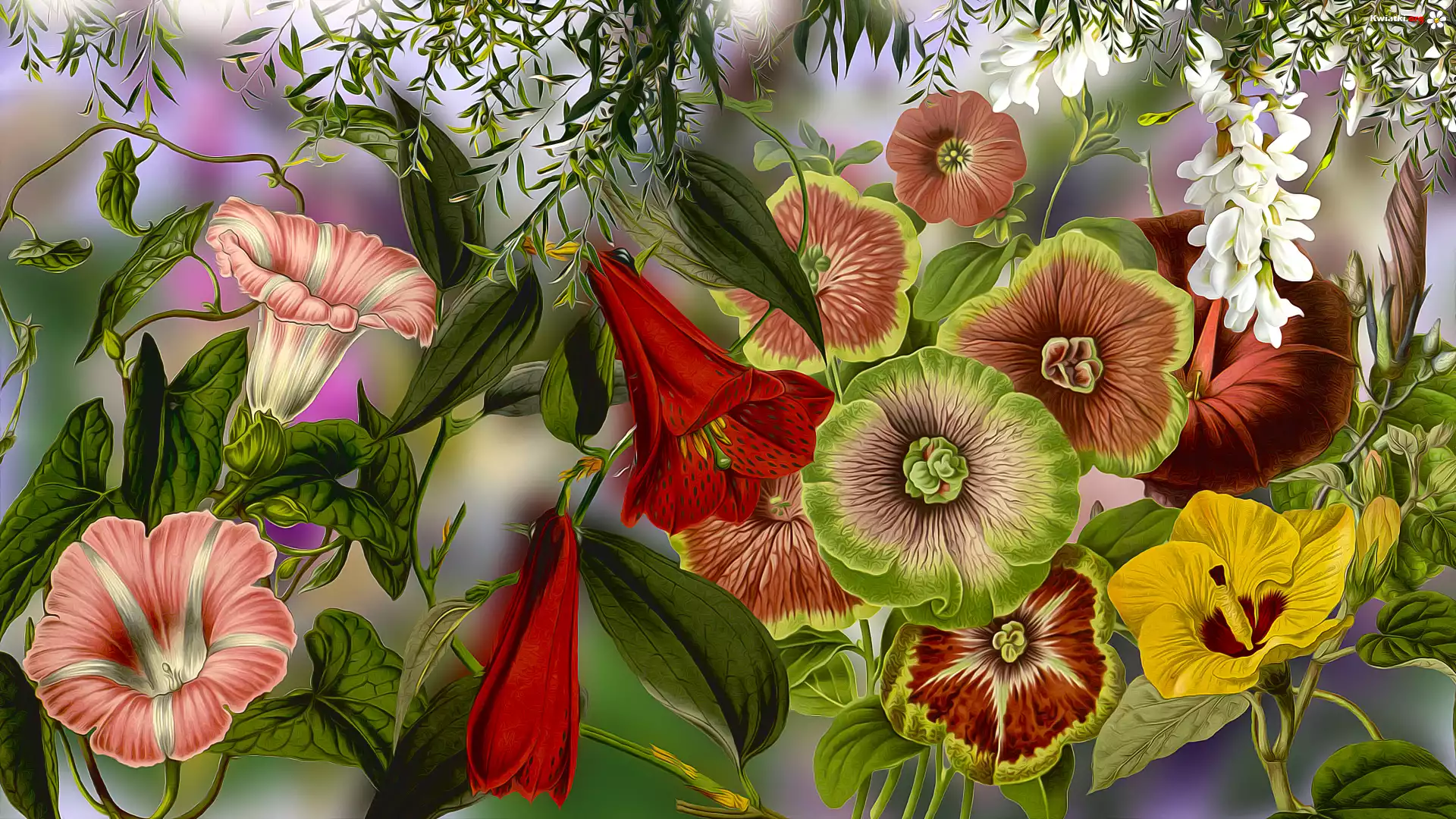 Różnokolorowe, Kwiaty, Powoje, Listki, Grafika - Zdjęcia