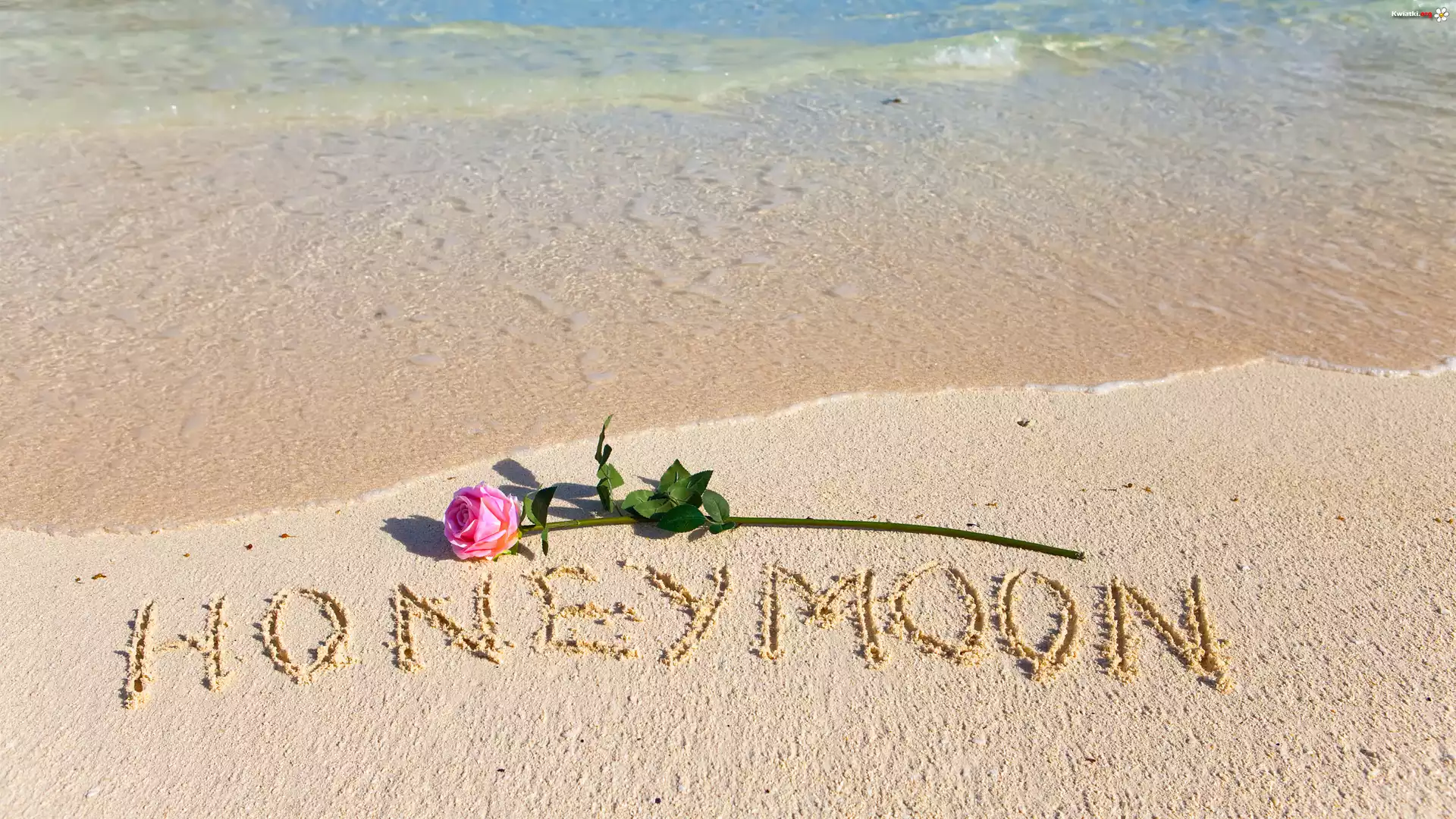 Kwiat Plaża, Różowa, Róża, Piasek, Napis, Honeymoon, Miesiąc miodowy
