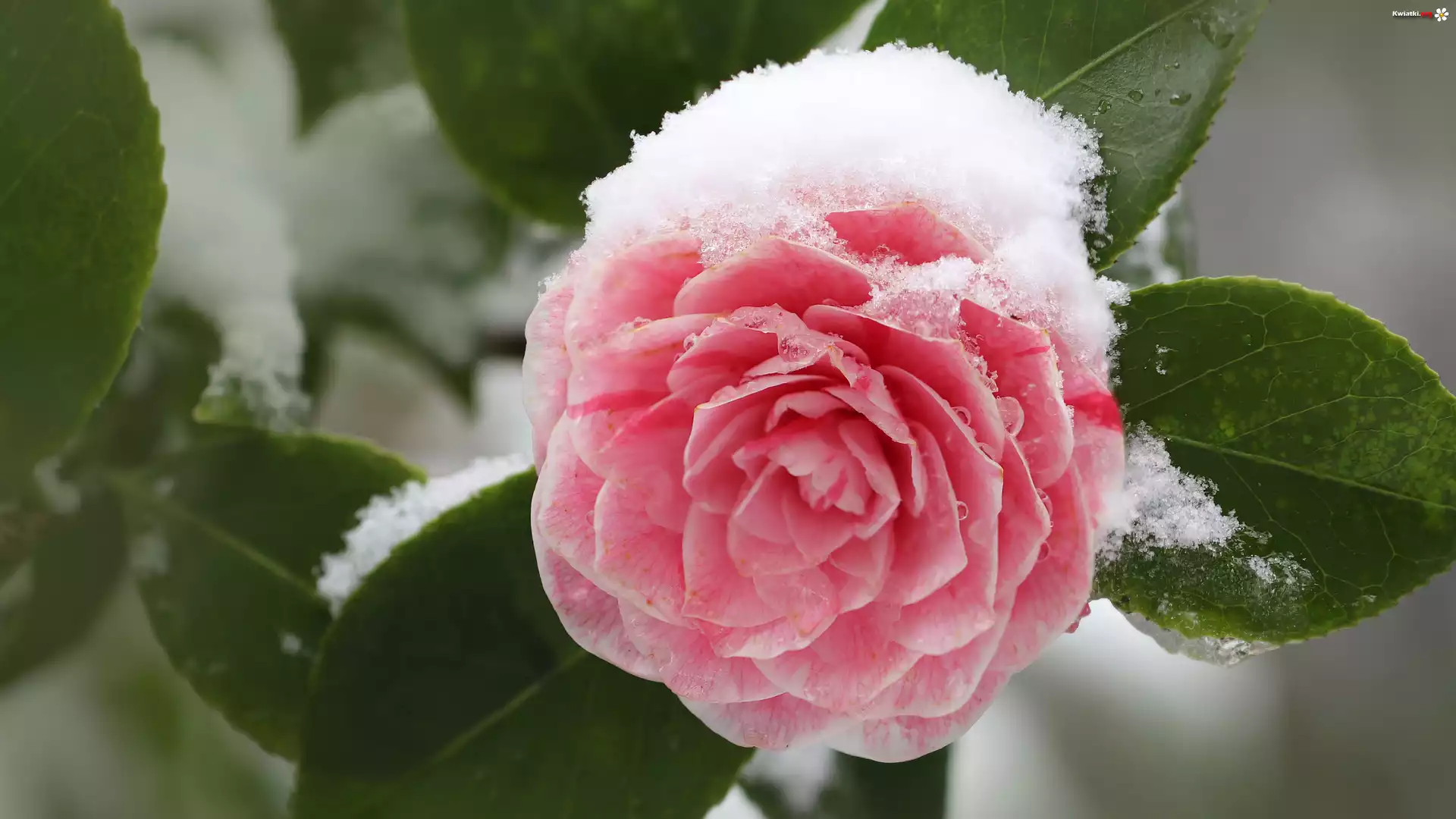 Kwiat Różowa, Kamelia, Śnieg, Liście
