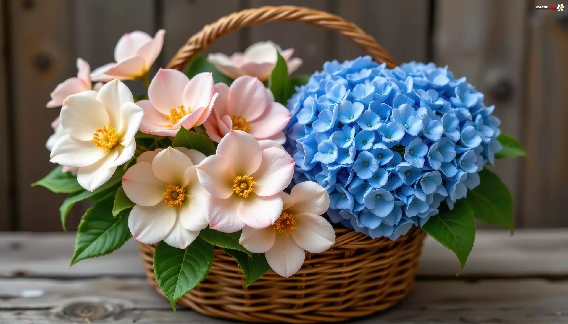 Niebieska, Hortensja, Biał-różowe, Kwiaty, Wiklinowy, Koszyk - Zdjęcia