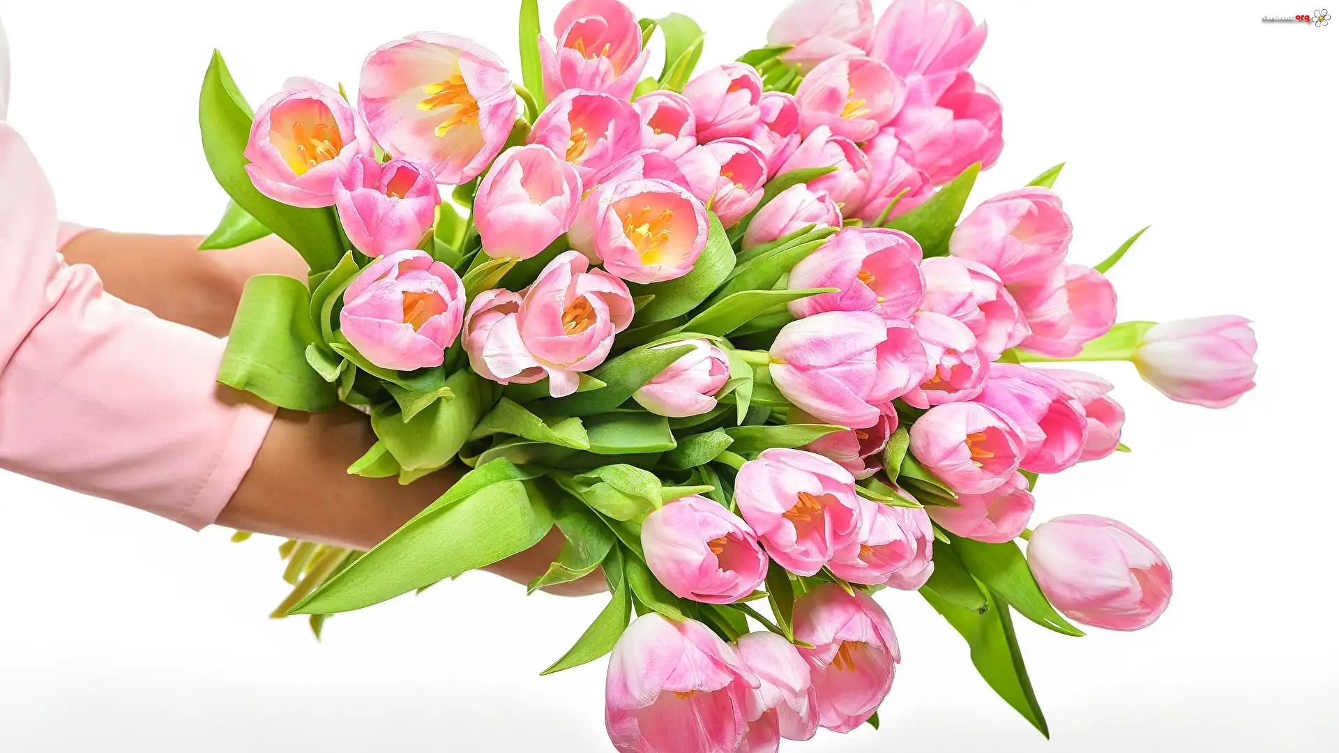 Różowe, Tulipany, Bukiet, Ręce, Białe tło - Zdjęcia