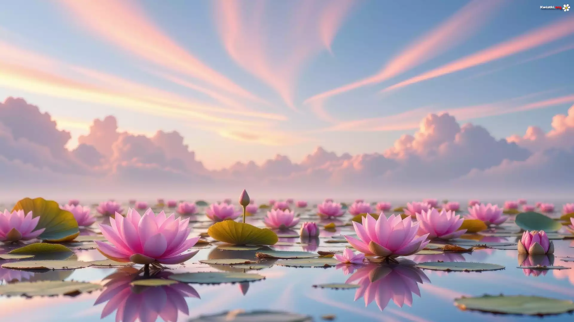 Kolorowe, Niebo, Chmury, Różowe, Kwiaty, Lilie wodne - Zdjęcia
