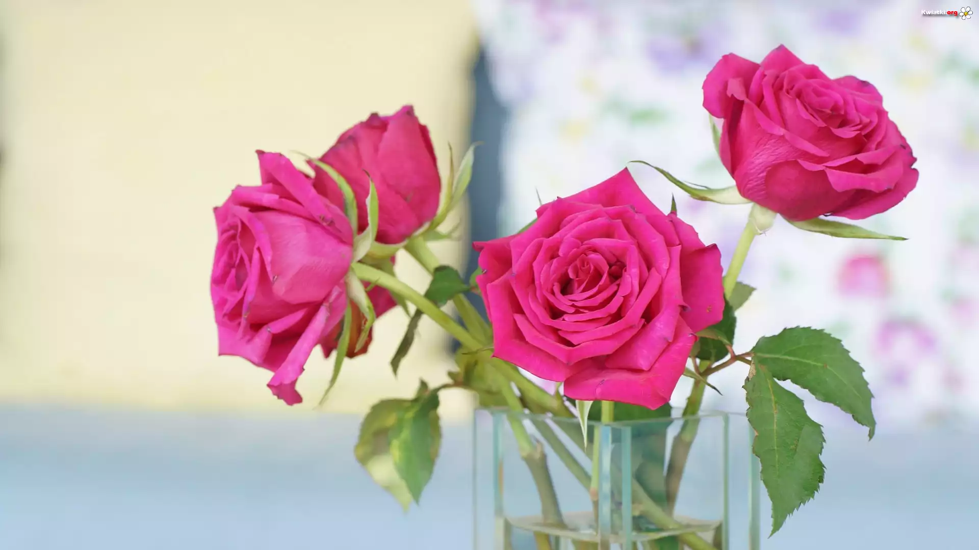 Cztery, Różowe, Róże, Szklany, Wazon, Rozmyte, Tło - Zdjęcia