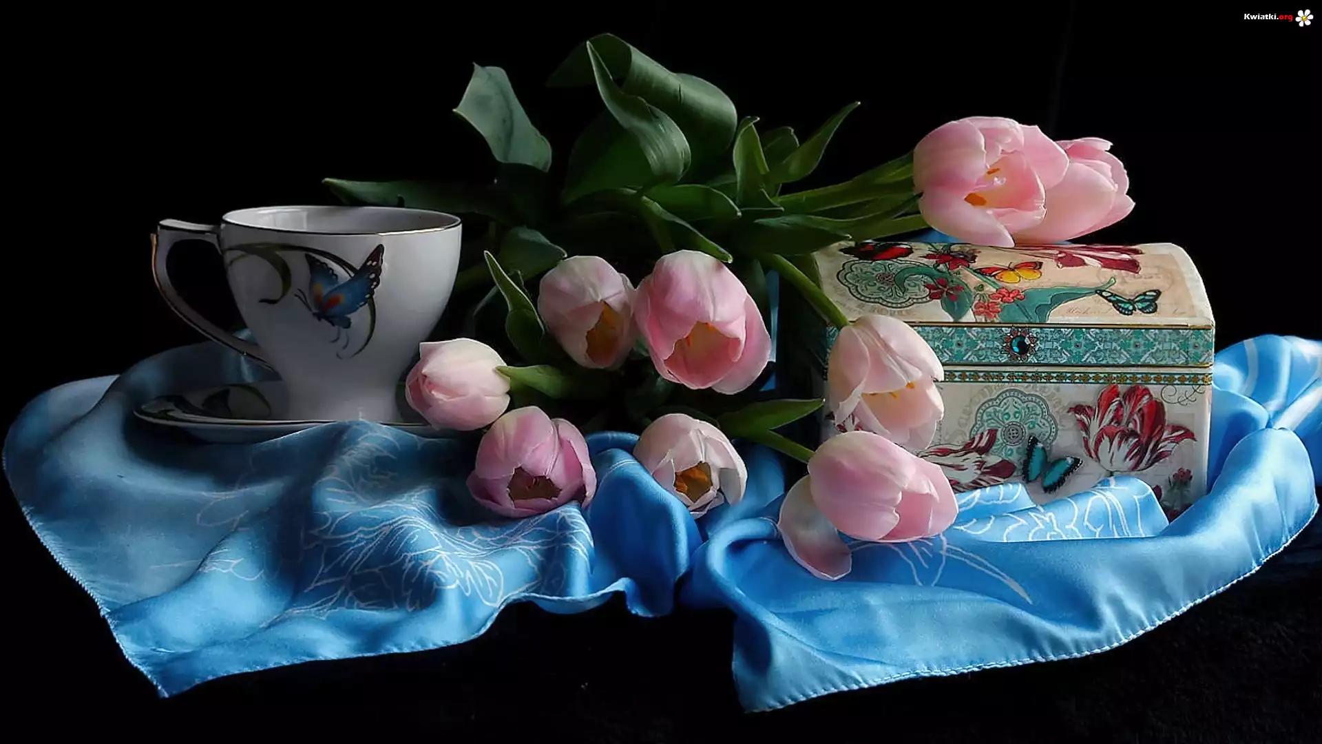 Kwiat Różowe, Tulipany, Pudełko, Filiżanka, Tkanina