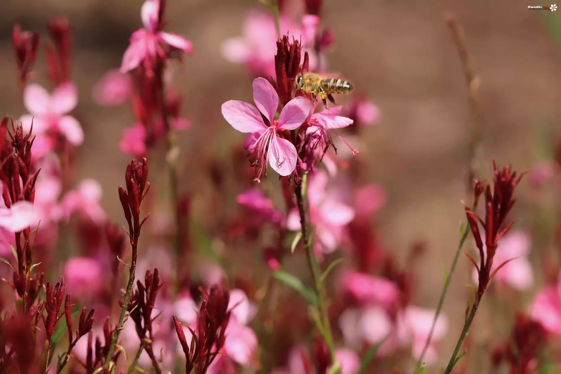 Różowe, Kwiaty, Gaura, Pszczoła - Zdjęcia